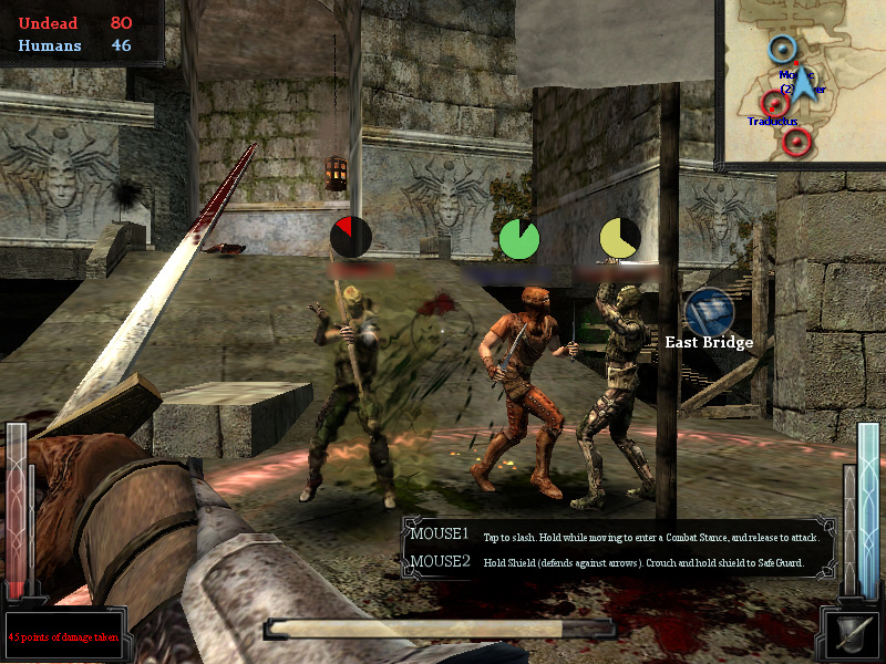 Dark Messiahにおける戦闘システムは,よくあるメレー系のアクションゲームとはやや異なっている。デフォルトでは左クリックが攻撃,右クリックで防御という設定になっており,左クリックをしばらく長押しすることで,より破壊力のある“パワーストライク”を発動できる。倒れている敵に対するフィニッシュムーヴにもそれぞれに違うアニメーションが用意されているなど,アクションはかなりバリエーションに富んでいる。