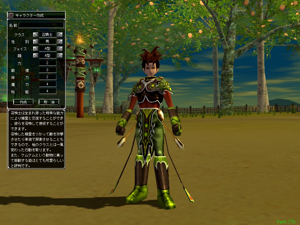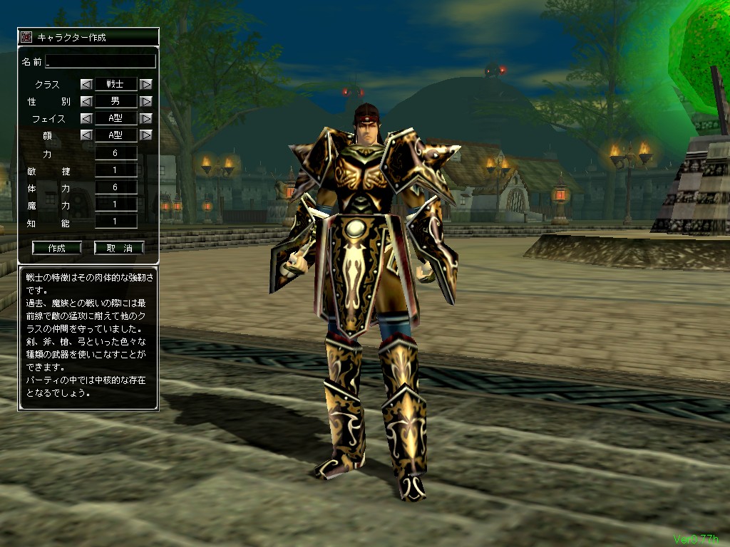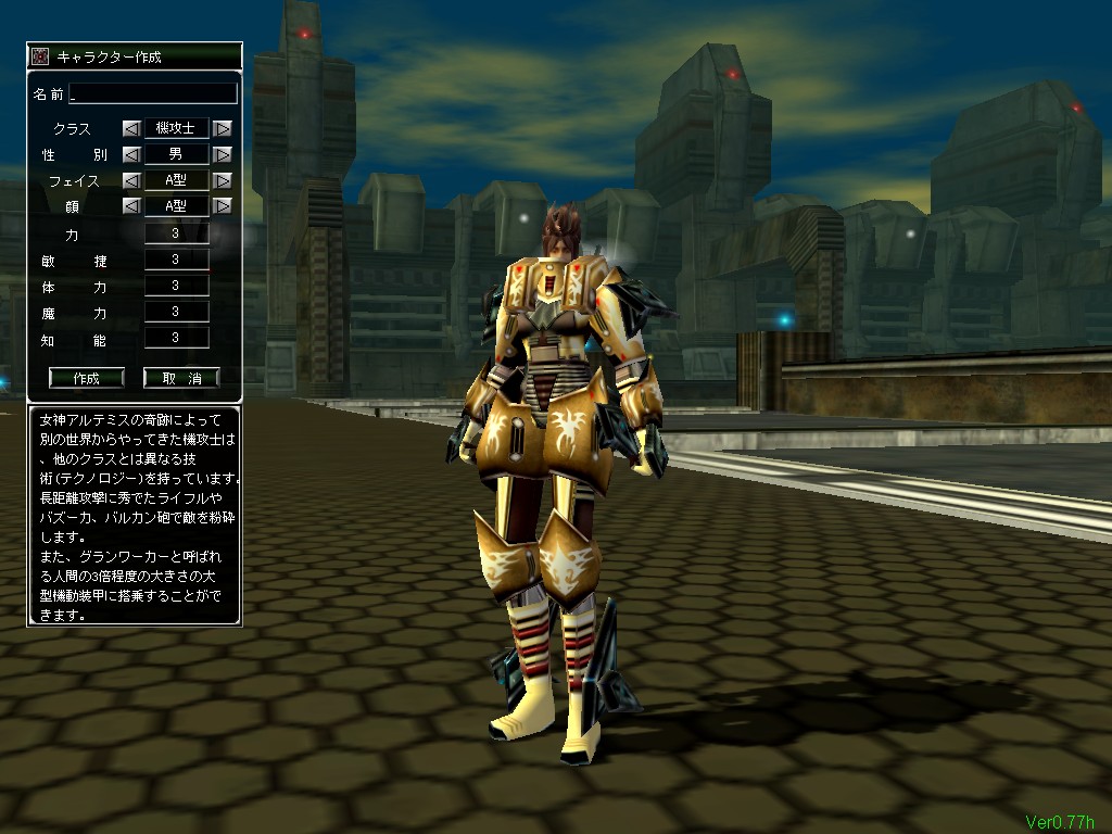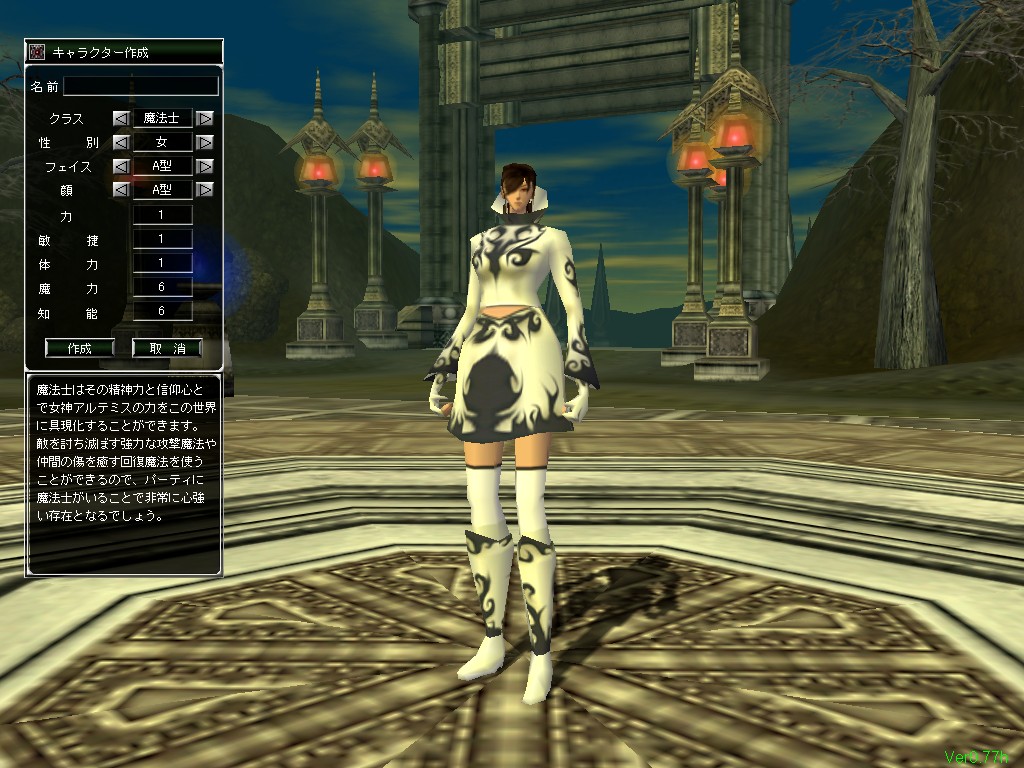 この中で,戦士と機攻士は男女両方の性別を選択できるが,魔法士は女性だけ,召喚士は性別不明(少年のような姿)だけとなっている。このほかに,キャラクターの顔や髪型をそれぞれ10種類程度の中から選択できる。本作のキャラクターモデルは,足がとても長いわりに顔がものすごく小さいので,違いがあまりよく分からないのが残念なところ。