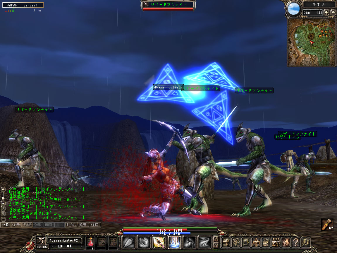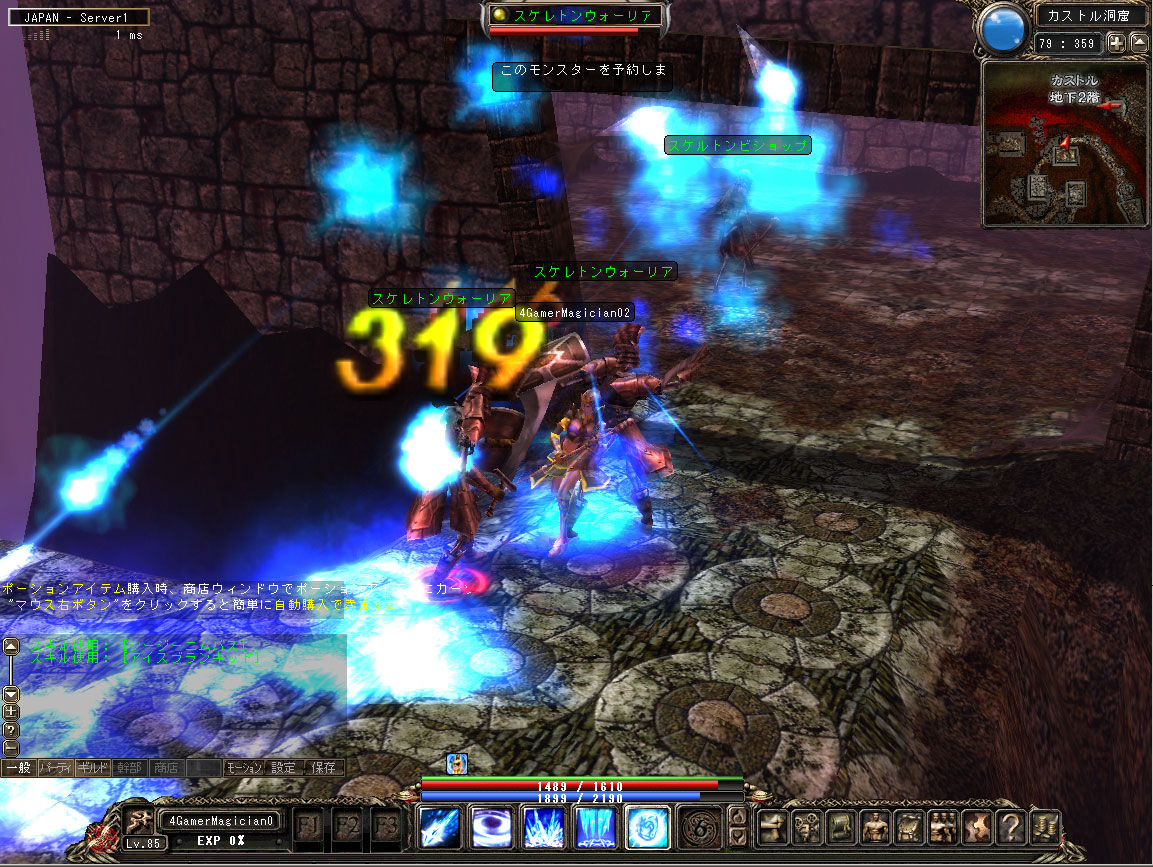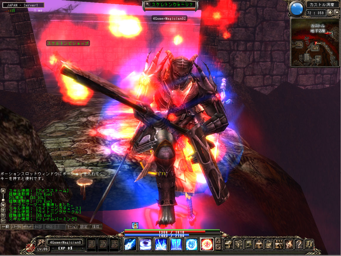 | きらびやかな鎧に身を包むナイト。武器は2セット用意可能で,Tabキーで切り替えられる。コンボの爽快感がウリ | ハンターの貫通攻撃スキル。右下に矢の残数が表示されている。狩りに出かけるときには忘れずに補充しておきたい | マジシャンの魔法は綺麗なエフェクトで彩られる。豊富なスキルを持ち,ショートカットスロットの数に悩まされそう |