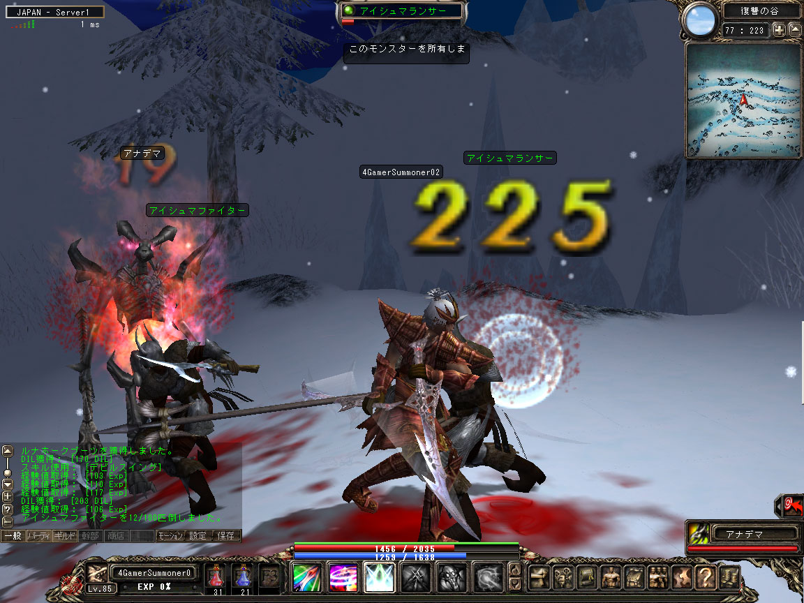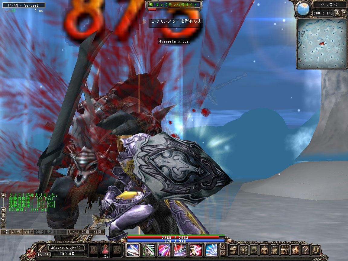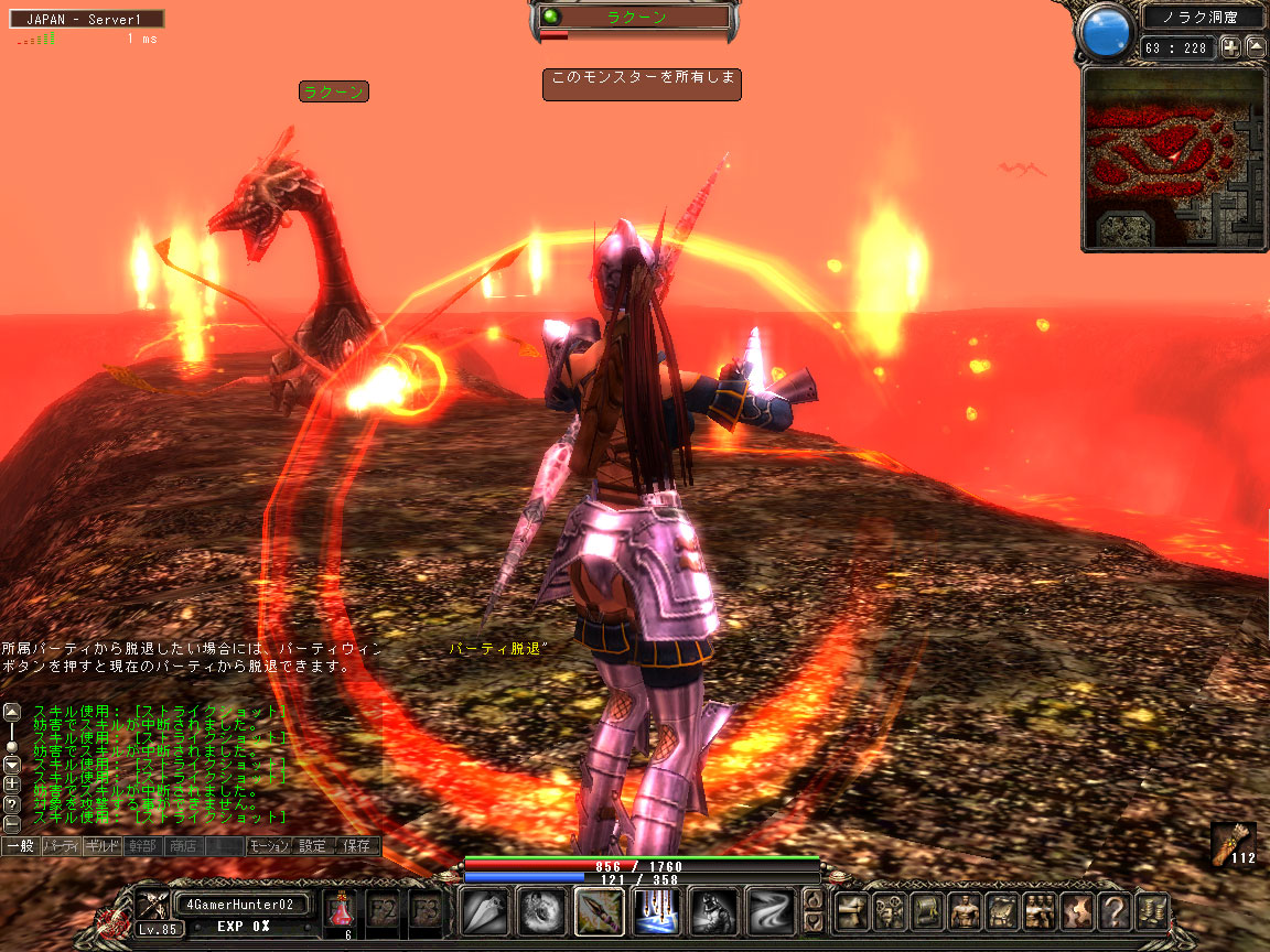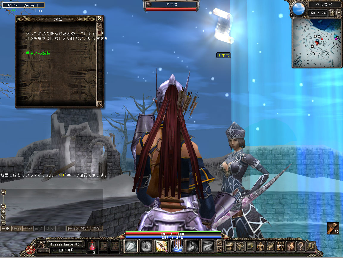 | きらびやかな鎧に身を包むナイト。武器は2セット用意可能で,Tabキーで切り替えられる。コンボの爽快感がウリ | ハンターの貫通攻撃スキル。右下に矢の残数が表示されている。狩りに出かけるときには忘れずに補充しておきたい | マジシャンの魔法は綺麗なエフェクトで彩られる。豊富なスキルを持ち,ショートカットスロットの数に悩まされそう |