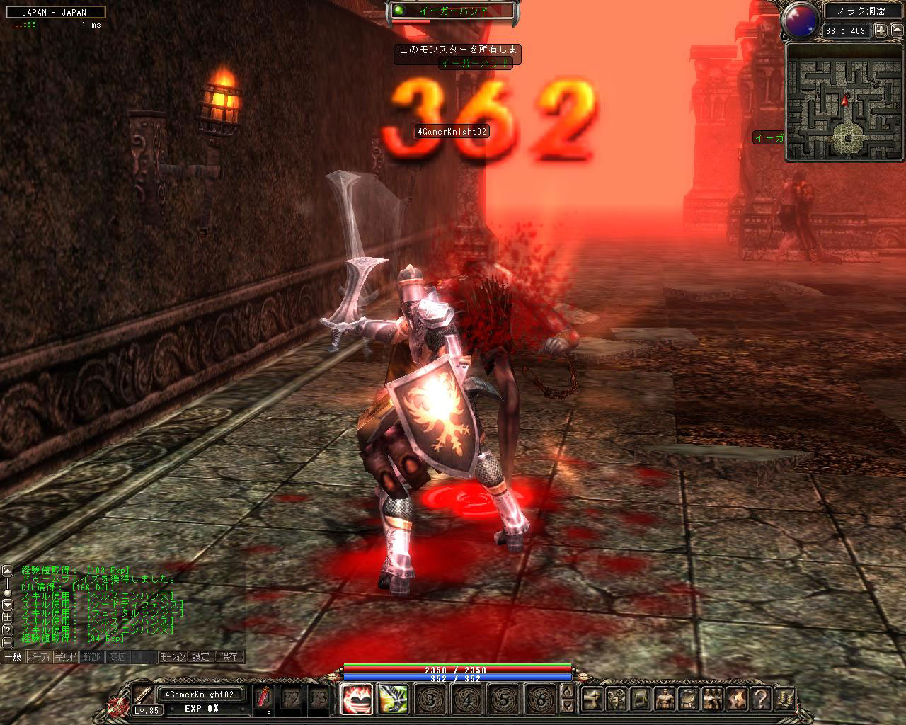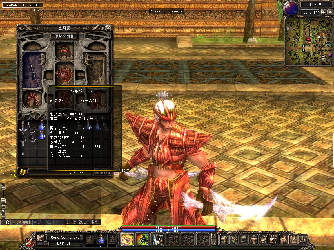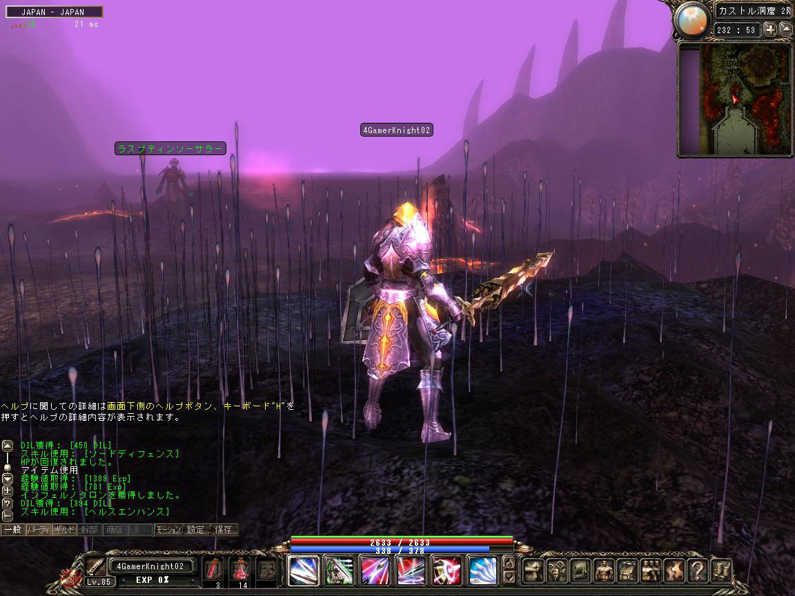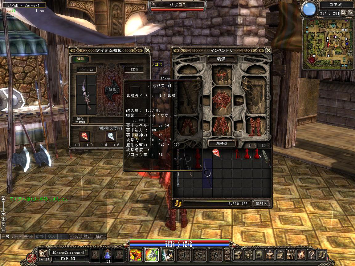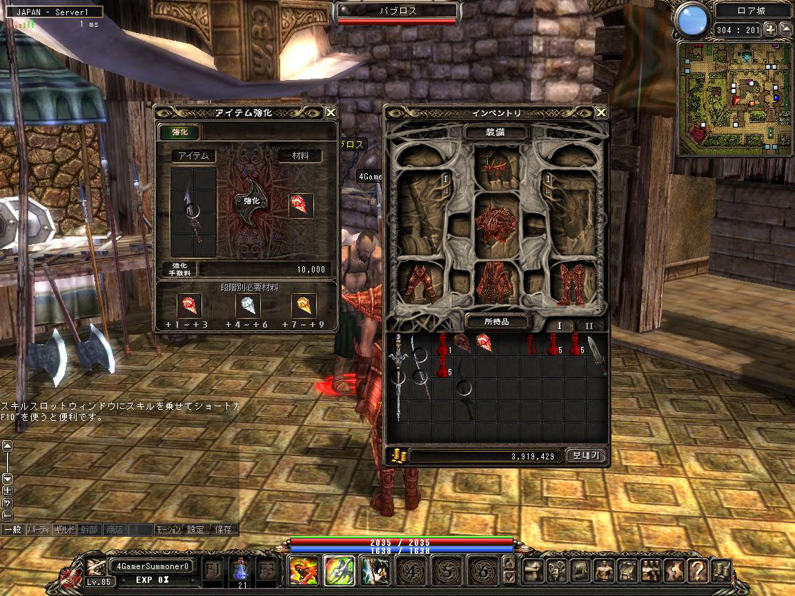 もう一つ,本作の世界観を特徴づけるものに,その装備品の豪華絢爛さがある。より強い装備は必ず,弱い武器より「華美」に表現されている。武具を精錬すれば光り出し,傍目に見ても目立ちまくる。その色彩感覚は,筆者にはちょっとついていけない部分であったりもするのだが,デフォルトのキャラクターの外見が固定であるがゆえ,こういう差異化はある意味必然ともいえる。「より強力なアイテムを!」という要求にも,「カッコいい装備をコレクションしたい」という欲求にも,ストレートに答えてくれる要素だ。