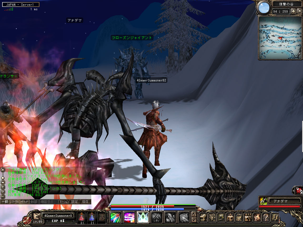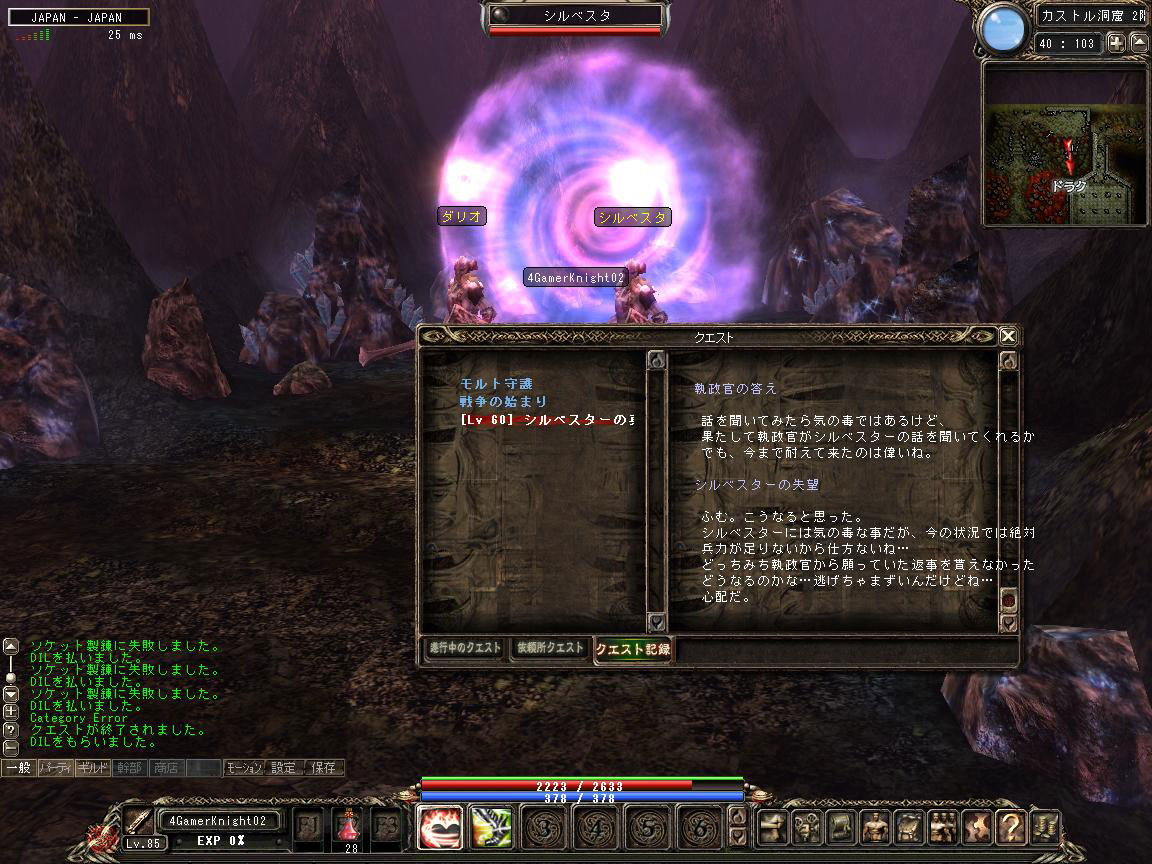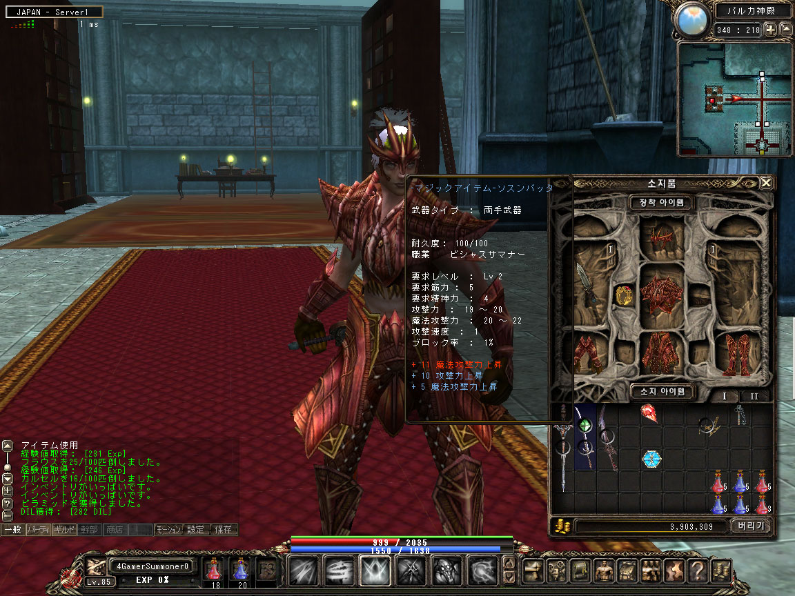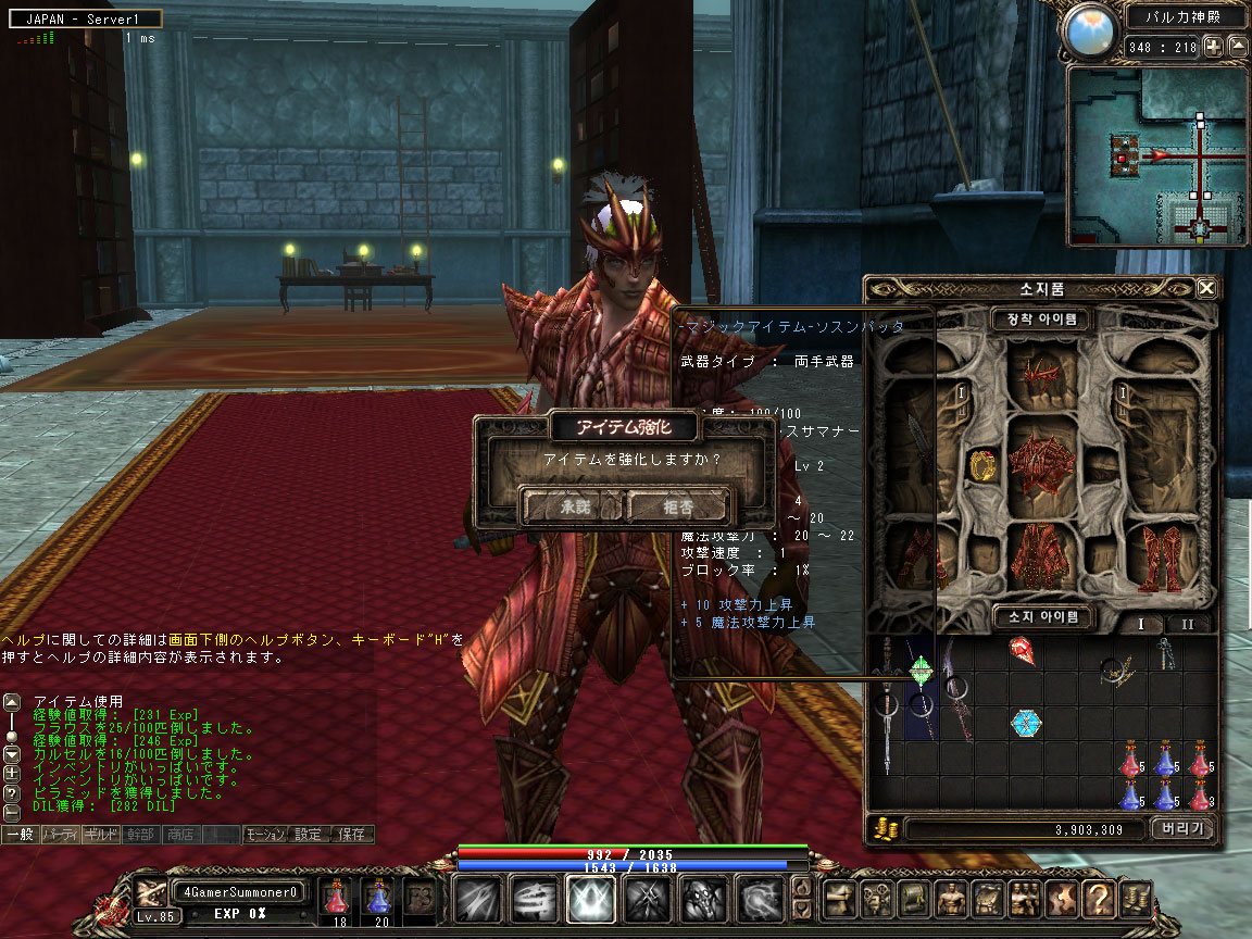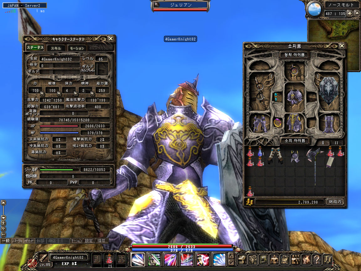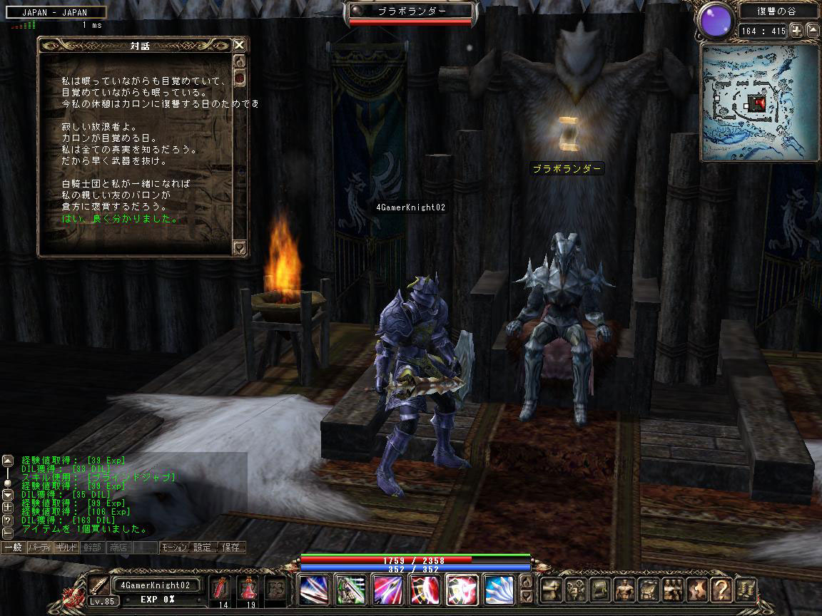 もう一つ,本作の世界観を特徴づけるものに,その装備品の豪華絢爛さがある。より強い装備は必ず,弱い武器より「華美」に表現されている。武具を精錬すれば光り出し,傍目に見ても目立ちまくる。その色彩感覚は,筆者にはちょっとついていけない部分であったりもするのだが,デフォルトのキャラクターの外見が固定であるがゆえ,こういう差異化はある意味必然ともいえる。「より強力なアイテムを!」という要求にも,「カッコいい装備をコレクションしたい」という欲求にも,ストレートに答えてくれる要素だ。