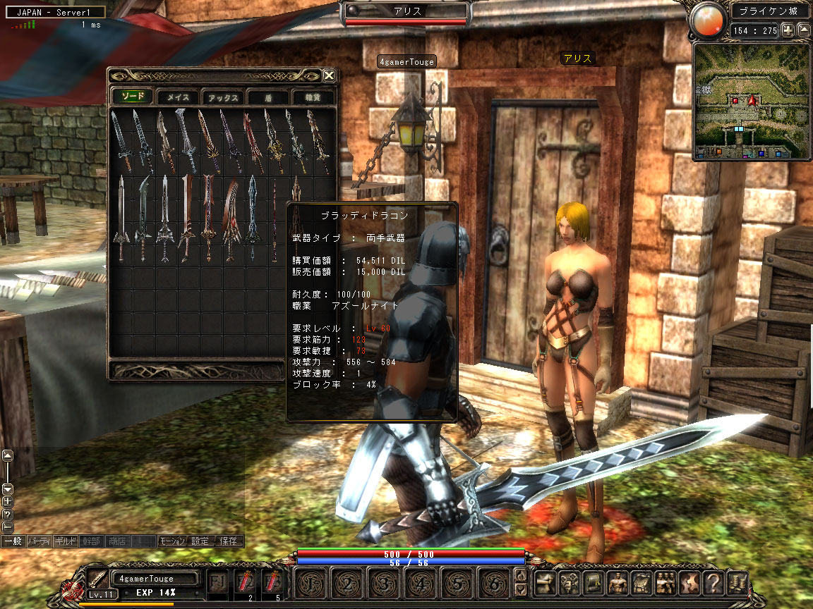 武器と防具は,後述するクラスによって使えるものが決まっている。自分のクラスの武器商人と防具商人は隣り合って配置されているので,場所を覚えておくといいだろう。装備品はクラスによる制限のほか,レベルやステータスによる制限もある。懐に余裕があっても,実力以上のものは装備できないことに注意しよう。また装備している武器によって,使えるスキルにも制限がかかる。例えば弓を使うスキルは,当然ながら弓を装備していないと発動できない。