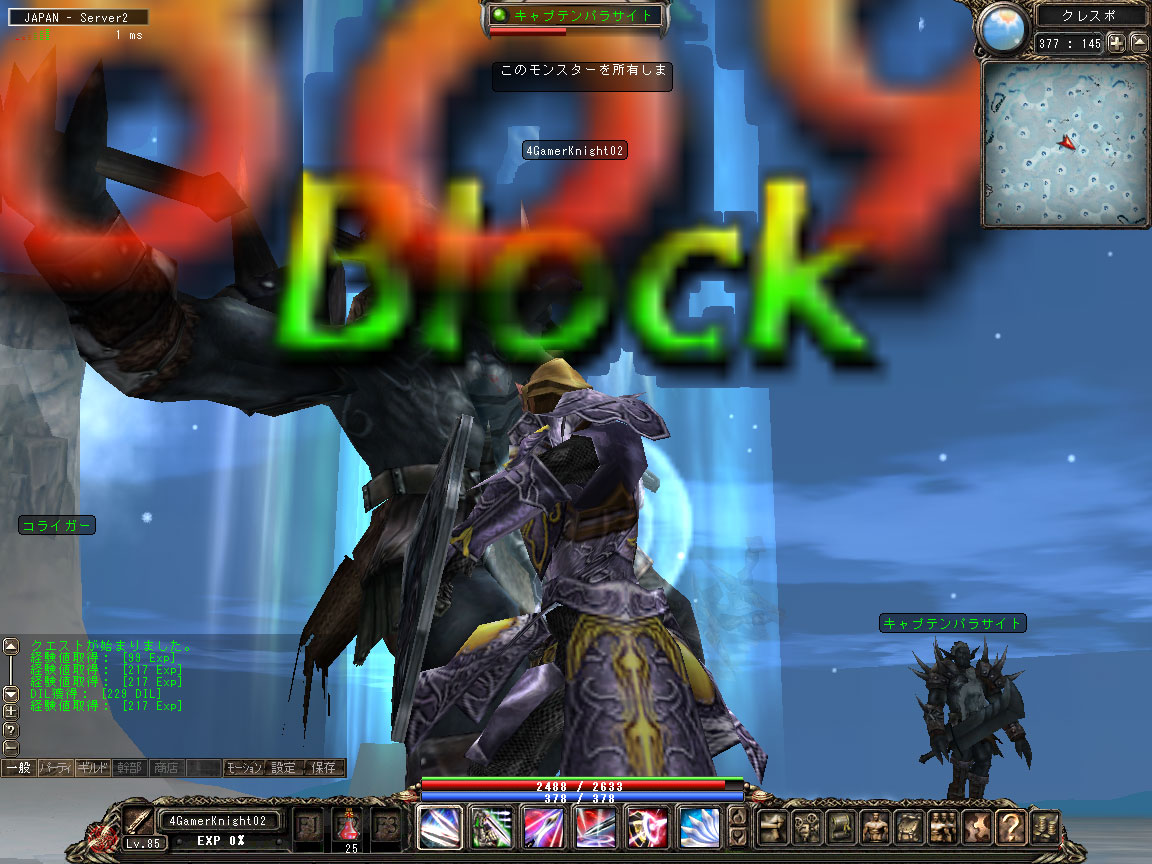 この点で,筆者もずいぶん悩んでしまった。ぶっちゃけ「ブロック」とは,つまりほかのゲームでいうところの「ミス」に相当する。本作では「ミス」が発生した場合,ナイトなら盾を構えてガチンとこれを受け止める。ゲームのヘルプによると,「ブロックが発生すると相手のコンボを止められ,また少しのあいだ敵の動きを止められる」とある。ところが敵がコンボを使ってくることは,少なくとも筆者が見たところなく(モンスターに限った話だが),また攻撃が敵にブロックされた場合でも,次のこちらの攻撃が間に合ってしまうため,ここに駆け引きは存在しない。