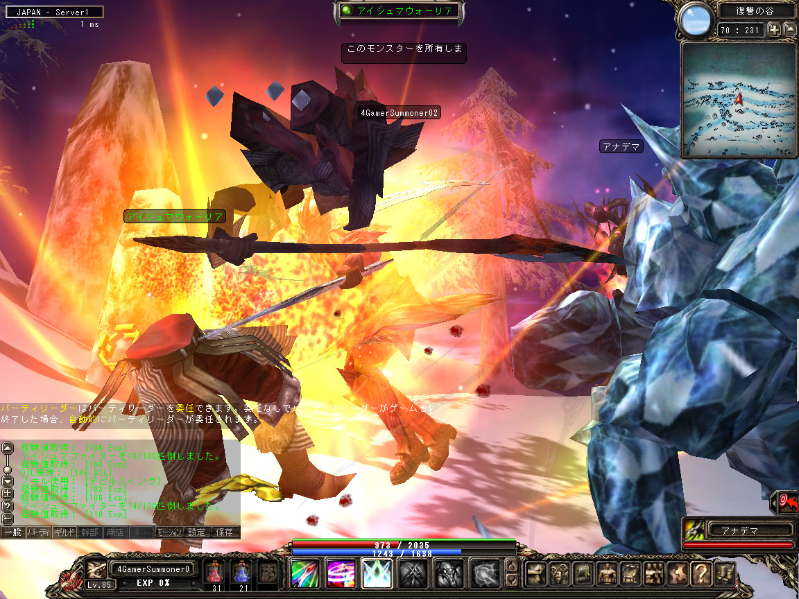 | サマナーの召喚したモンスターは,サマナーの傍に寄り添い,自動的に攻撃を行う。右下のアイコンでモンスターの状態と指示を確認できる。分かりにくいかもしれないが,手前のごついのが使役しているモンスターだ |