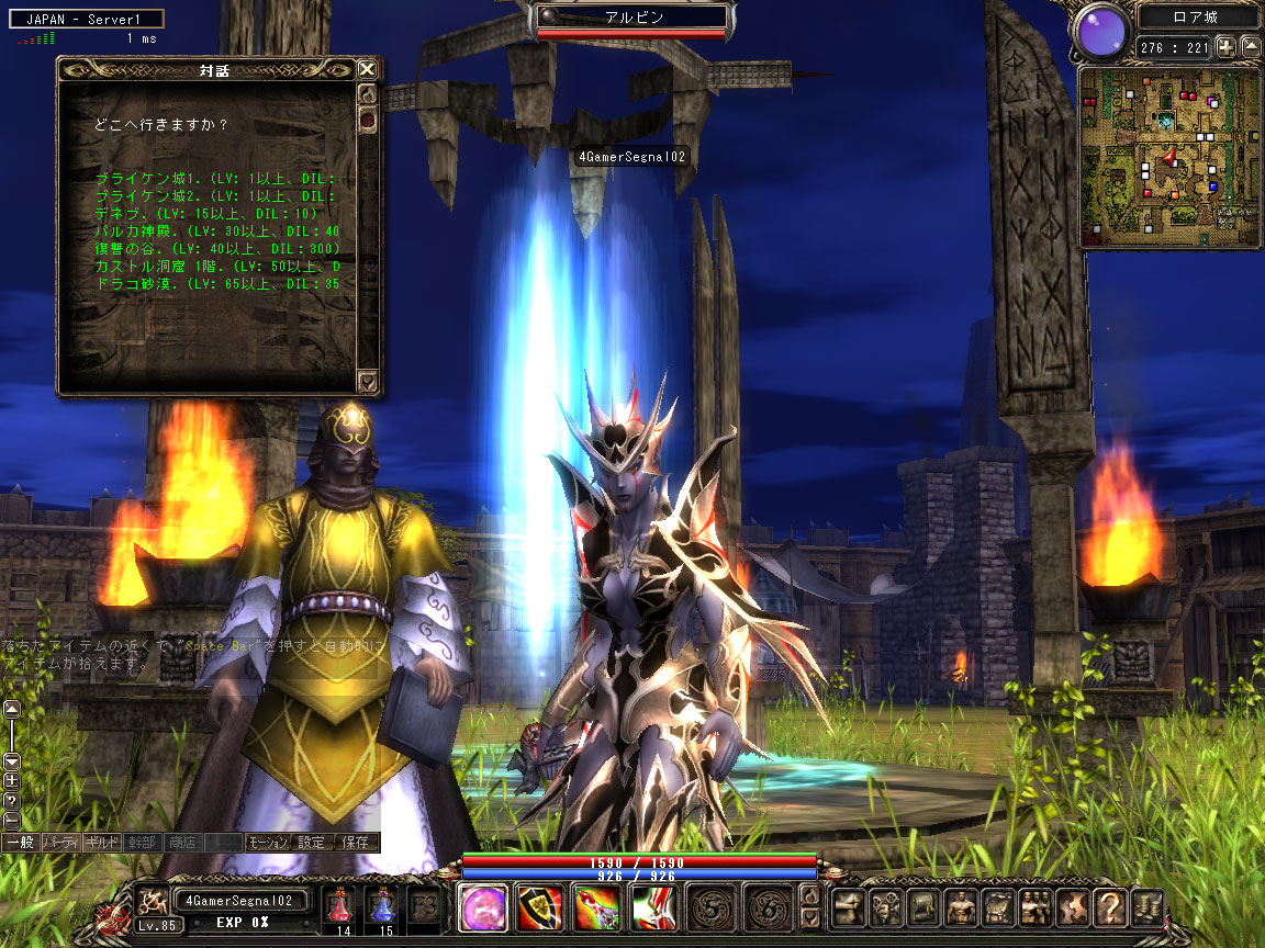 | 精錬によって光を帯びた武器。細かい点ではあるが,ちゃんと見た目に反映されるのが嬉しい | 主要なマップへは街から直通のテレポーターが用意されている。無駄な移動時間が省けて便利だ |