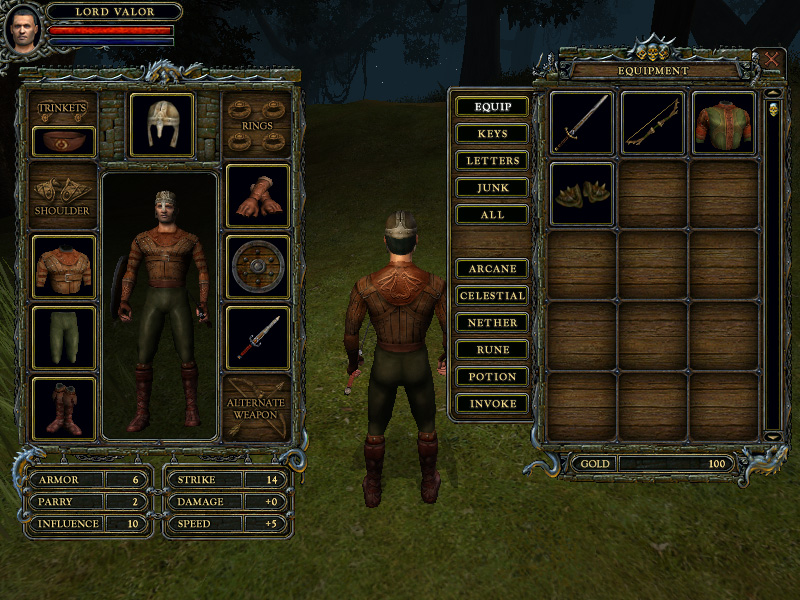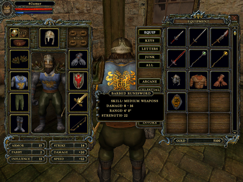 デモ版でゲームが始まったときは,キャラクターは"DAGGER"など,最低限の装備を身につけているのみ。まずはEキーを押してインベントリを開き,手持ちのアイテムの中から,"Penalty"のない範囲で良いものを装備しよう。このPenaltyは,そのアイテムに対応するスキルがないときなどに発生するようだ。なお,スキル"LIGHT WEAPONS"が3になると"MEDIUM WEAPONS"を,この"MEDIUM WEAPONS"が3になると"HEAVY WEAPONS"を習得できるようになる。ARMORやSHIELDも同じである。早く良い装備を身につけたい人は,これらのスキルを優先して上げるといいだろう。
