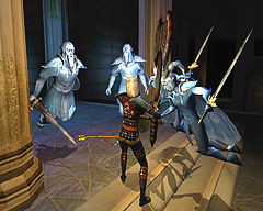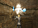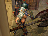 気になった点もいくつか挙げておこう。アクションがかなりのウェイトを占めている割には,キー入力に対する反応が微妙に遅かったり,歩いていて,ちょっとした出っ張りに引っかかったりと,操作性の面ではあまり良い点をあげられない。とくに狭い足場の上を渡るときや,柱の上をジャンプで飛び移っていくといったシーンでは,この操作性の悪さが顔を出し,かなりのストレスを感じた。加えて,左右への平行移動と,後ろに下がるときの速度がやけにノロいのも,ストレスを増幅させる原因だろう。