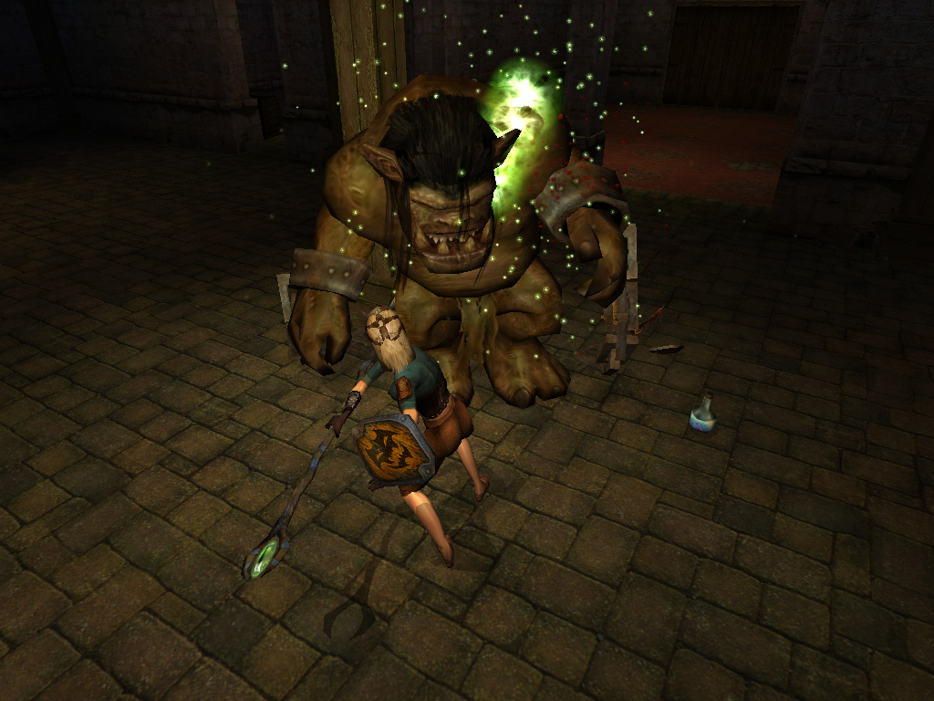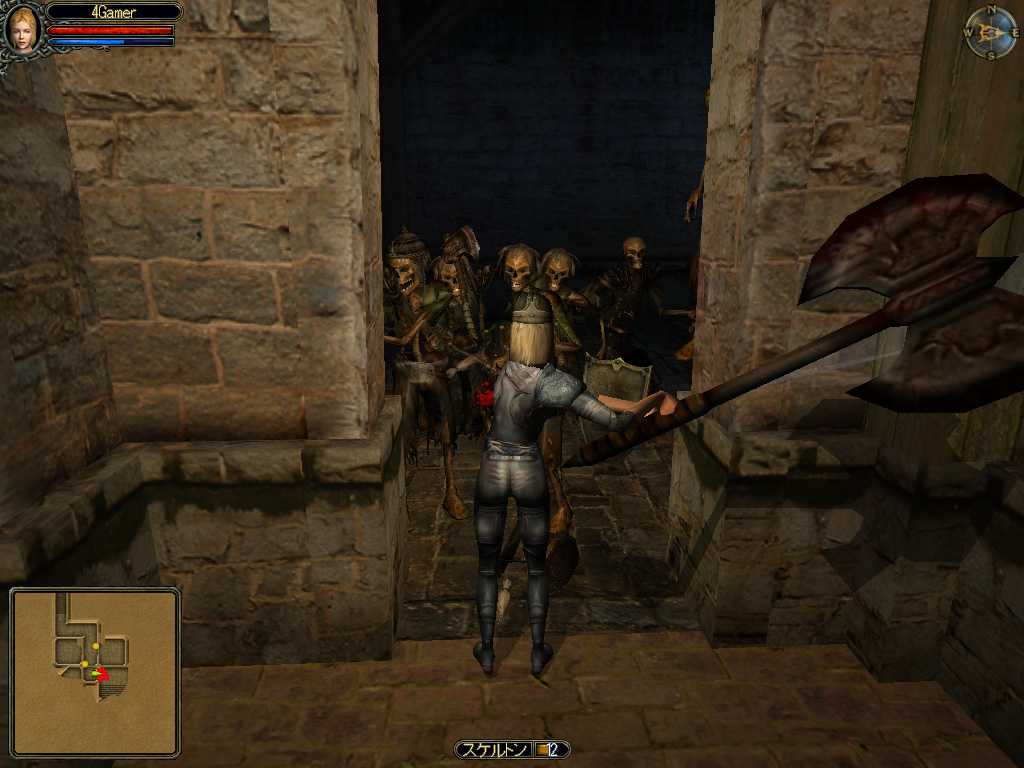 盾を装備していると,マウスの右クリックで防御の姿勢がとれ,この間は(正面からの)敵の攻撃を防げる。防御に関しては,つい適当になりがちだが,飛び道具や魔法といった間接攻撃を使う敵が増えてくる中盤以降は,防御を積極的に攻撃に取り込んでいかないと,効率良く勝つことは難しいだろう。