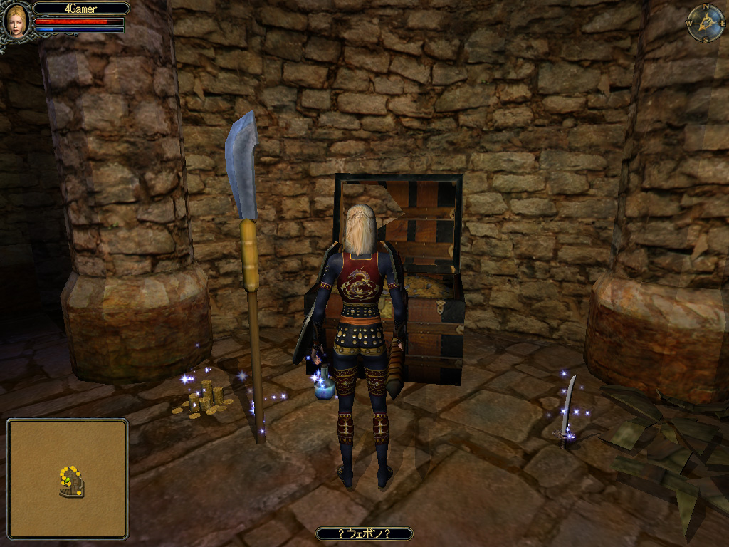 | お金を払ったものの,抽象的な話ばかり。一応ヒントのようだが…… | 宝箱を開けたら,中から武器が出てきた! 誰もが心躍る一瞬だろう | 日本の鎧や兜のような防具も登場する。ワキザシなんていう武器もある |