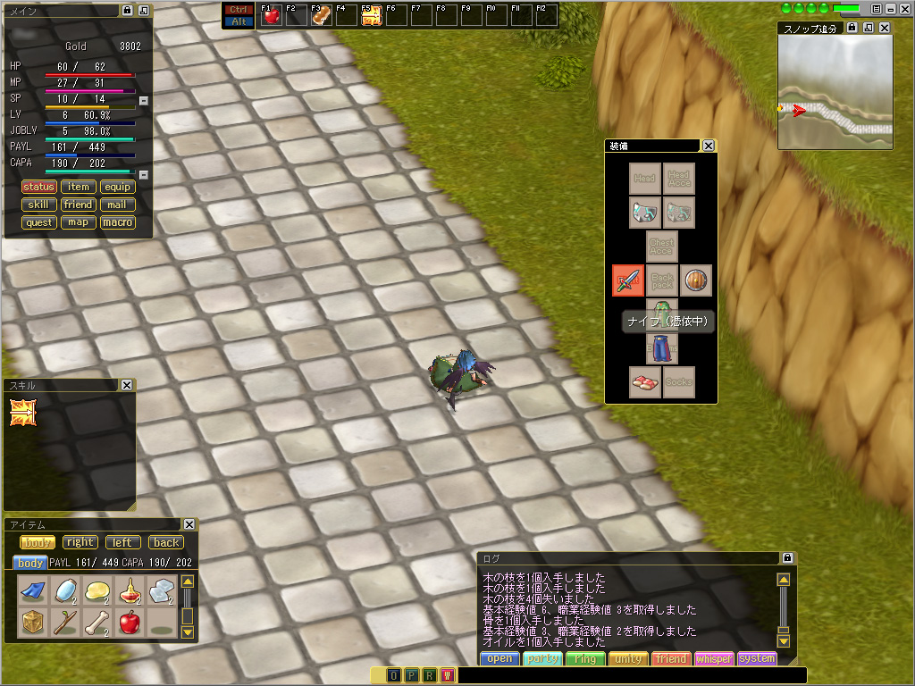 これらのシステムは,とくに時間のないプレイヤーにはありがたいものだ。武器に憑依して道端に落ちていれば,拾って使ってもらえる可能性もある。うまくいけばログアウトしている間にもキャラがある程度育つ。また,マリオネットに露店を開かせておけば,貴重なプレイ時間をアイテム販売に費やす必要がない。まだプレイしてみた期間が短いため,アイテム採集の実用性は判断しづらいが,これらをうまく使うことが,時間の足りないプレイヤーにとっては,プレイの幅を広げるためのキーとなるだろう。