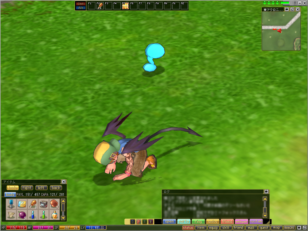 例えばECOのキャラクターがフィールドにいながらにしてHPなどを回復させたい場合,「座る」必要がある。この動作は右クリックで表示されるメニューから行えるが,キャラクターのアクションはそれ以外にも存在し,「マクロ」に登録されている。