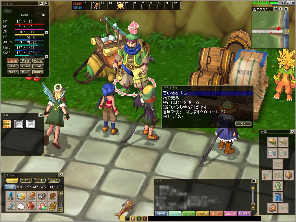 | アクロポリスシティの外で店を開いているギルド商人NPCは,銀行機能や倉庫機能なども提供している。倉庫機能については,管轄エリア内ならばどこでもアイテムを引き出せる |
