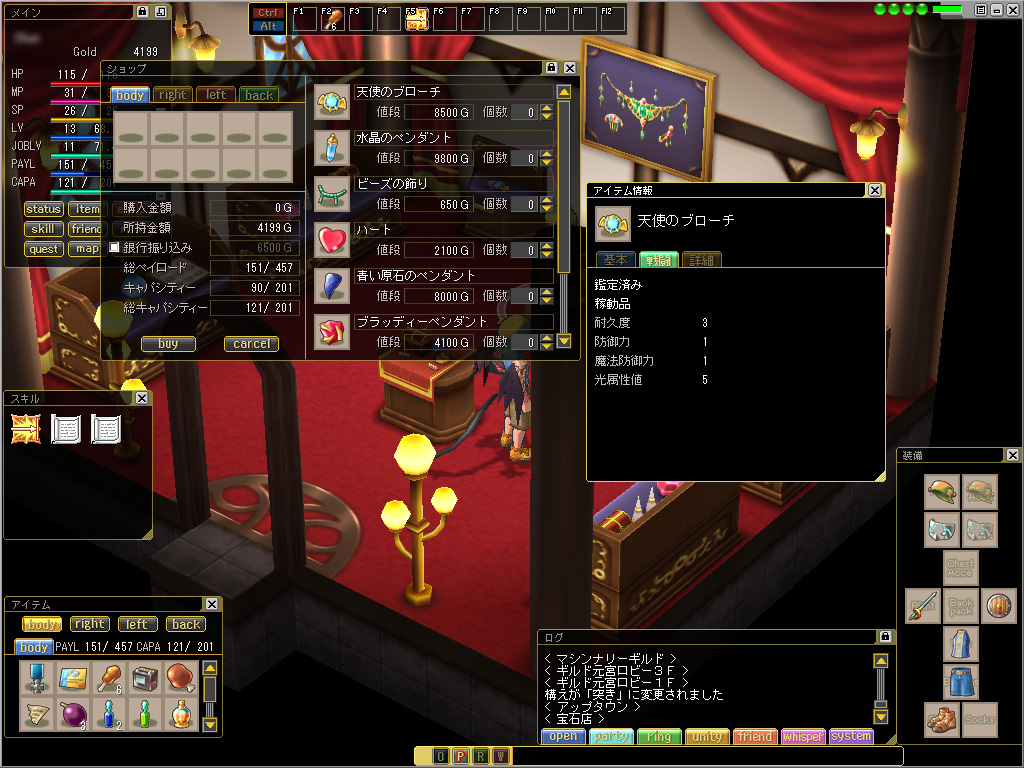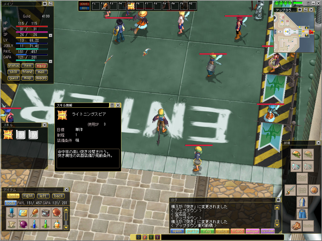 | アップタウンには宝石商が店を開いている。アクセサリーが売られており,特定の属性の攻撃を軽減するものもある | アクティブスキルと武器の関係には注意が必要。例えばフェンサーの「ライトニングスピア」では,普通の攻撃より多くのダメージを与えられるが,槍を装備していなければ使えない。武器を購入するときにはスキルも考慮する必要がある | |