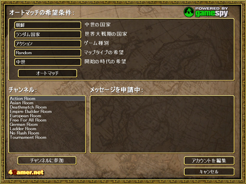 | マルチプレイ専用のサーバー。GameSpyの簡単な登録をする必要がある。図のオートマッチを押すとラダーゲームが簡単に遊べる |