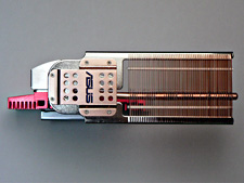 このため,可動ヒートシンクを90度回転させてCPUクーラーの上空に置くと,CPUクーラーのファンが起こすエアフローを利用できるようになるため,グラフィックスカード自体はファンレスのまま使える。こうやって利用する場合,国内で人気の某社製ファンレスGeForce 6600 GTグラフィックスカードを追加ファンなしで運用したときと比べて,グラフィックスチップの温度が最大40℃も低くなるという。