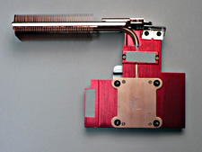 | ヒートシンク部を取り外してみた。可動ヒートシンクは左の写真で示した"おろし金"のようなフィンでヒートパイプを囲む形状になっており,写真上の方向へ最大90度傾けられる。右の写真は,グラフィックスチップやメモリチップとの接触面側から見たものだ。ヒートパイプが可動ヒートシンクに向かって伸びているのが分かる | |