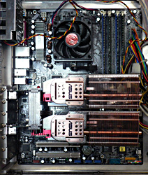 | SLI動作テストのイメージ。追加でファンを用意するとなると,SLIにおいてはこの配置が最も現実的だろう。テスト自体はケースに入れず,バラックで行っている |