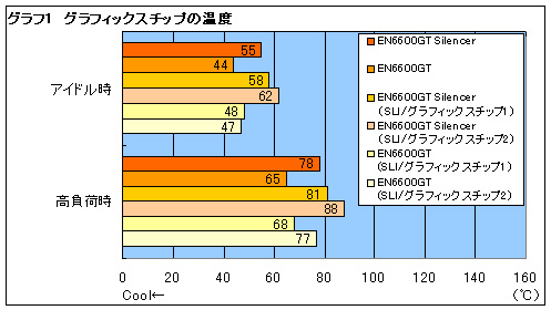 結果はグラフ1に示したとおり。アイドル時で比較すると,EN6600GT Silencerのグラフィックスチップ温度は55℃になっている。ファン付きのチップクーラーを搭載するEN6600GTと比べると11℃ほど高いが,ファンレスカードとしてはかなり優秀な値だ。高負荷時には78℃まで上昇しており,少々高め。だが,動作に問題が生じるレベルではなく,許容範囲といえるだろう。