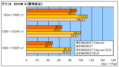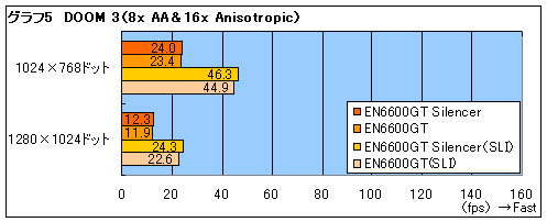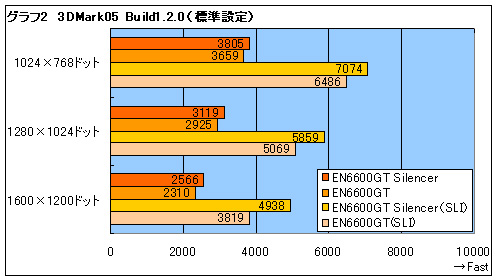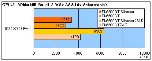 グラフ2,3は3DMark05のスコアだが,EN6600GT Silencerの1枚差し動作時は,メモリ容量の差もあって,標準設定で4〜11%,8x AA&16x Anisotropic有効時は19%ものスコア向上を確認できた。SLI動作をさせると,この差はさらに大きくなっている。