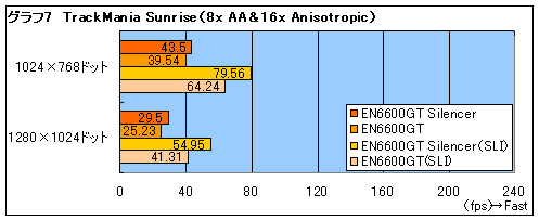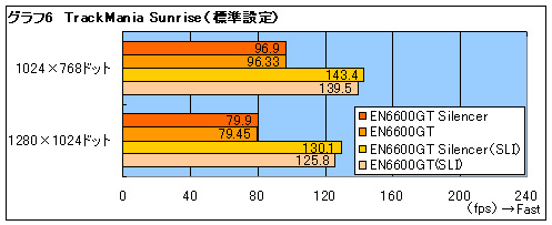 続いて,「DOOM 3」のTimedemoを利用し,平均フレームレートを計測してみた結果をグラフ4,5に,「TrackMania Sunrise」を用いて53秒程度で1周する「Paradise Island」というマップのリプレイを3周繰り返し,その間の平均フレームレートを「Fraps 2.60」を利用して計測した結果をグラフ6,7に示す。DOOM 3の標準設定では解像度にかかわらず3%ほどのスコア向上が見られた。DOOM 3と比べると負荷の低いTrackMania Sunriseでは,1枚差しの標準設定だとフレームレートはほとんど変わらないが,メモリ負荷の高くなる8x AA&16x Anisotropic有効時は,10〜17%ものフレームレート向上を確認できた。この差はSLI動作時だとさらに大きくなり,標準設定でも3%の差がついたほか,8x AA&16x Anisotropic有効時には24〜33%という大きな差が生まれている。