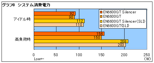 メモリ容量の差によって,EN6600GT Silencerのほうが全体的にわずかながら消費電力が大きくなっている。とはいえ,気にすべきほどの差ではないともいえよう。