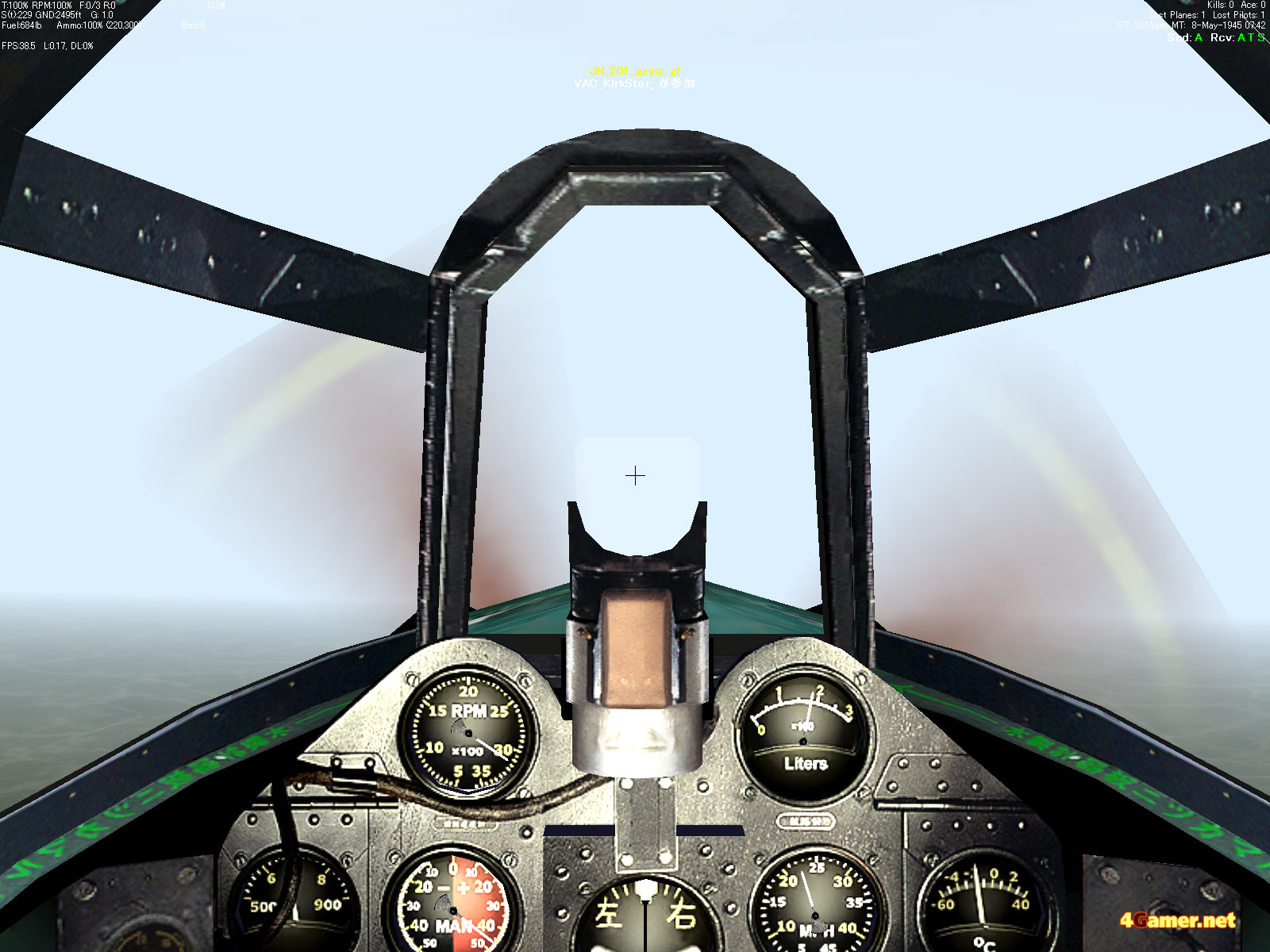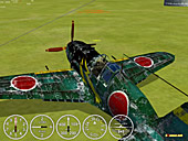 | コラム:Fighter Aceでの戦い方 筆者が自分なりに編み出したのは,激しいドッグファイトでプレイヤー同士が団子状態になっているところに外から突っ込み,狙いを付けた標的に弾を撃ち込むという戦法。スタッフのお勧めは,日本軍の機体を使って旋回戦を仕掛けるというもの。史実でもそうなのだが,FAの日本軍機も軽快な運動性がウリで,他国の機体に比べると特殊なパラメータになっている。クルクル回ることで,他国の機体には真似のできない旋回半径で背後を取って仕留めることが可能なのだ。なお,初心者にお勧めの機体は紫電改とのこと。この二つの戦術は空戦の基礎ともいえるもので,ここからさらにひねり込みや急降下を利用した加速など,さまざまなテクニックが加わる(それさえも基礎中の基礎だが……)。 |