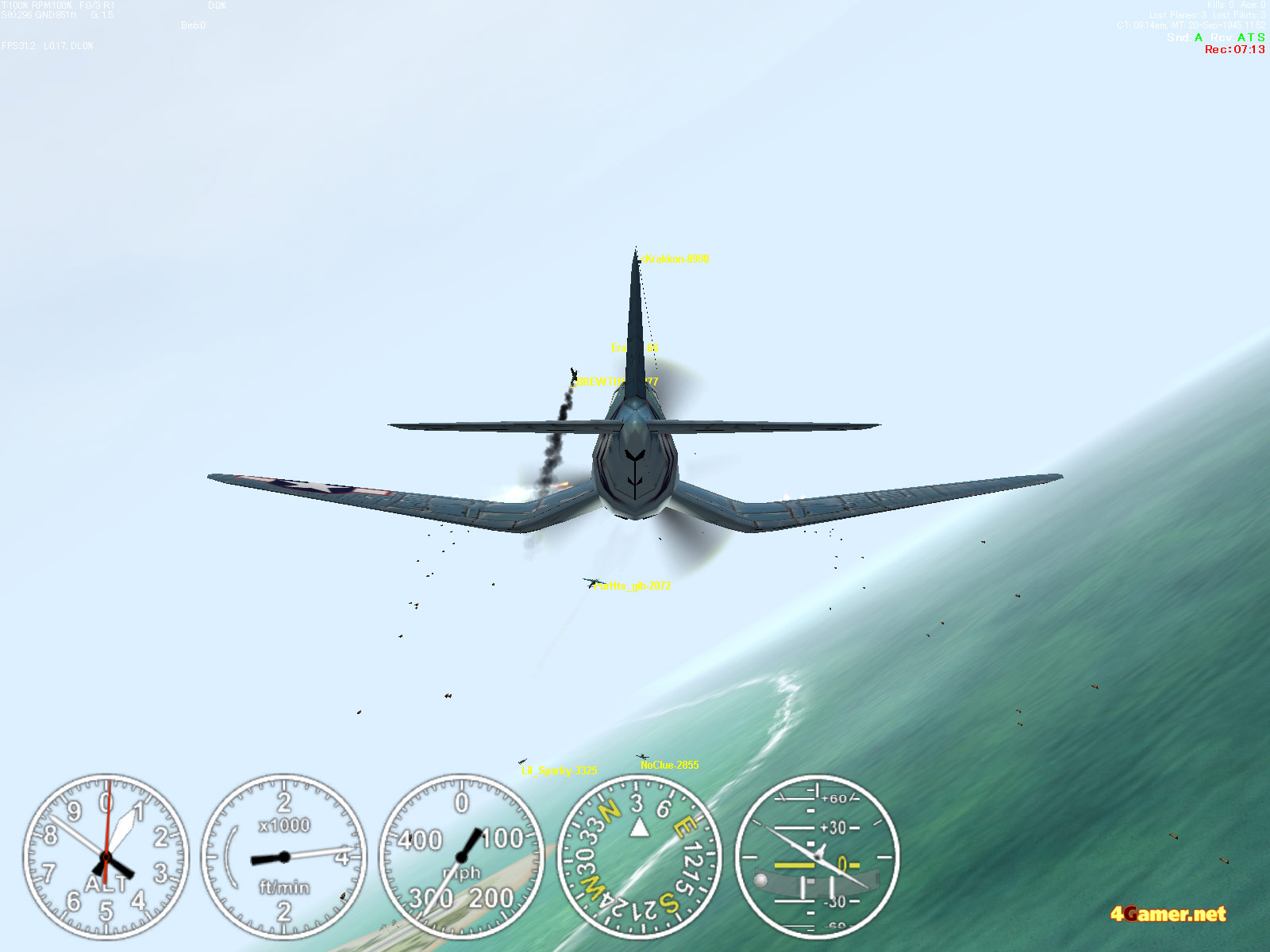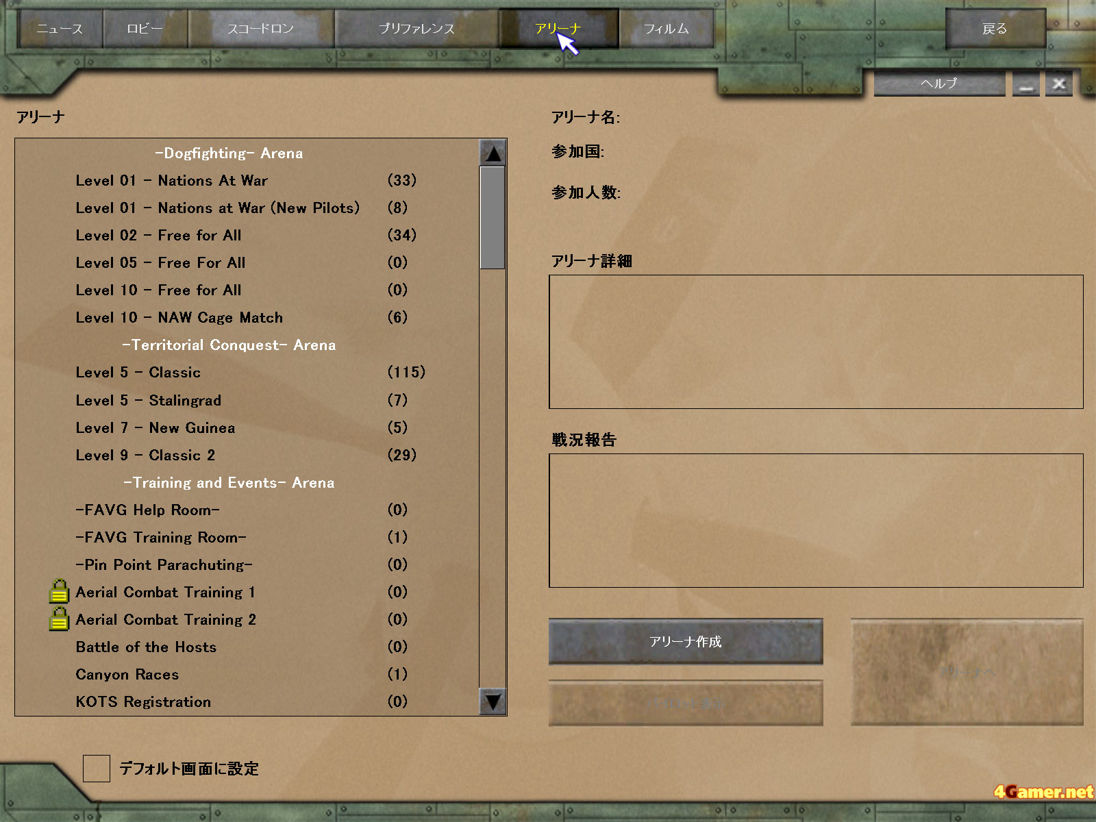 | 朝のアリーナ選択画面。アメリカの夜の時間には平日でも非常に多くのプレイヤーが集まる。日本でも対戦相手には事欠かないが,この独特の雰囲気も体験してほしい | いくら撃っても,悲しいほどに当たらないということは多い。勝てるようになるには修行が必要なのだ | ものすごく小さな旋回半径で動くことができる日本軍機。そこそこのエンジンと装甲を持つ紫電改は,初心者おすすめの機体 |