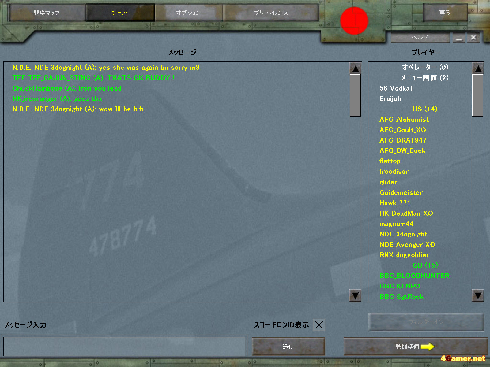 | チャット画面。戦闘中は難しいが,簡単な打ち合わせを行える。戦況次第では指示に徹することも | 爆撃視点。マップに工場などが表示されているので,目的地への爆撃は容易だ。しかし,単独行動よりも作戦に従って実行したほうが楽しいだろう |