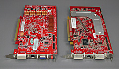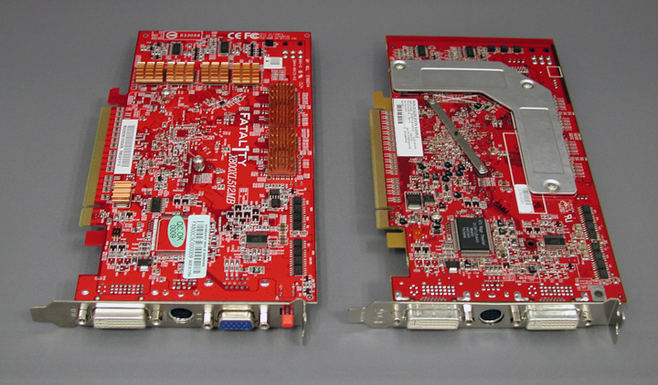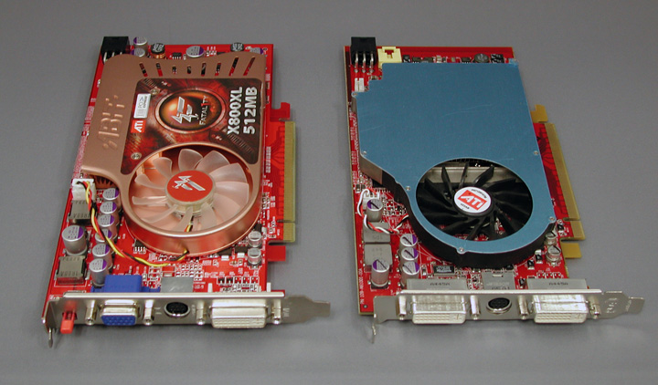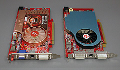 | グラフィックスメモリ512MB版Radeon X800 XLのリファレンスカード(いずれも右)と比較してみた。出力インタフェースだけでなく,Rage Theaterを搭載していないという違いもあるので,コンポーネント出力は行えない。一方,メモリチップなどにヒートシンクを搭載しているのが確認できる | |