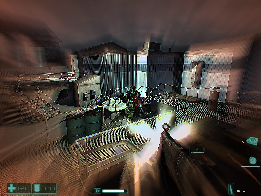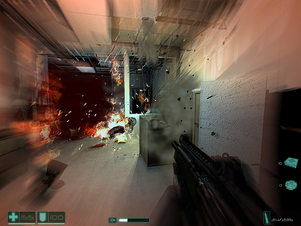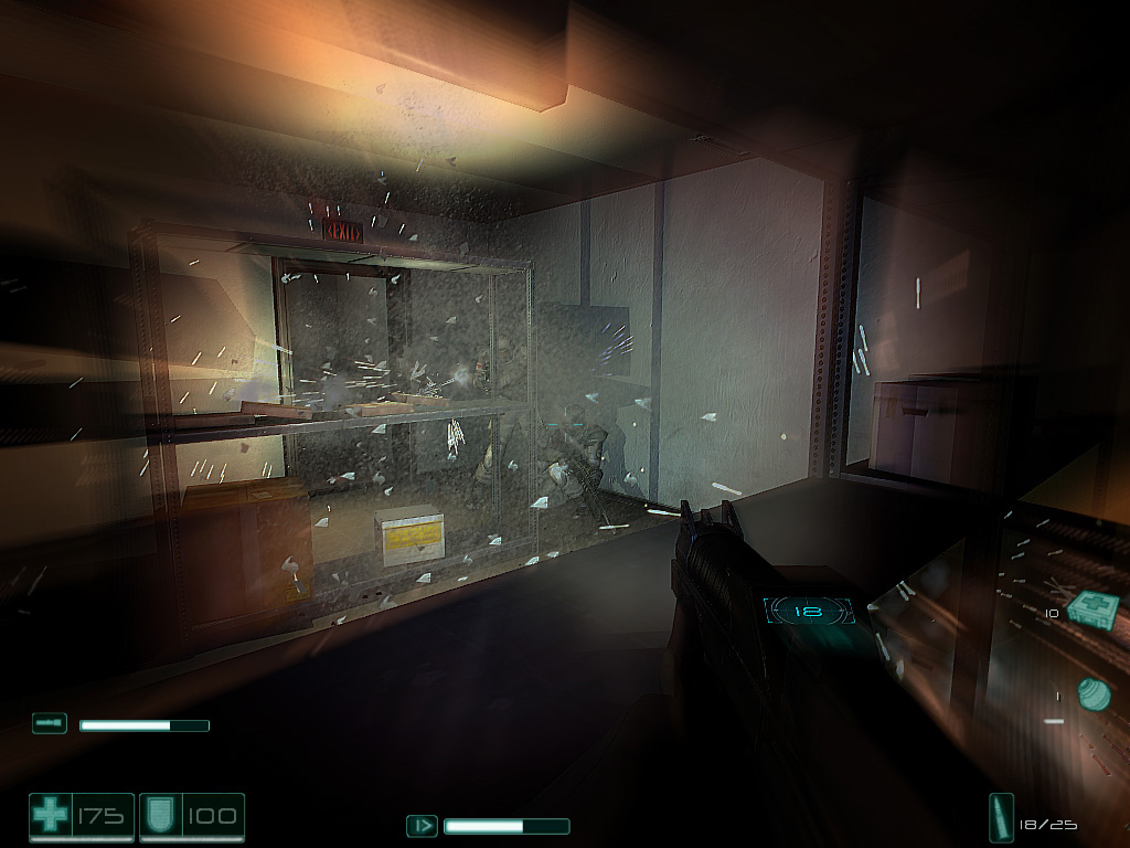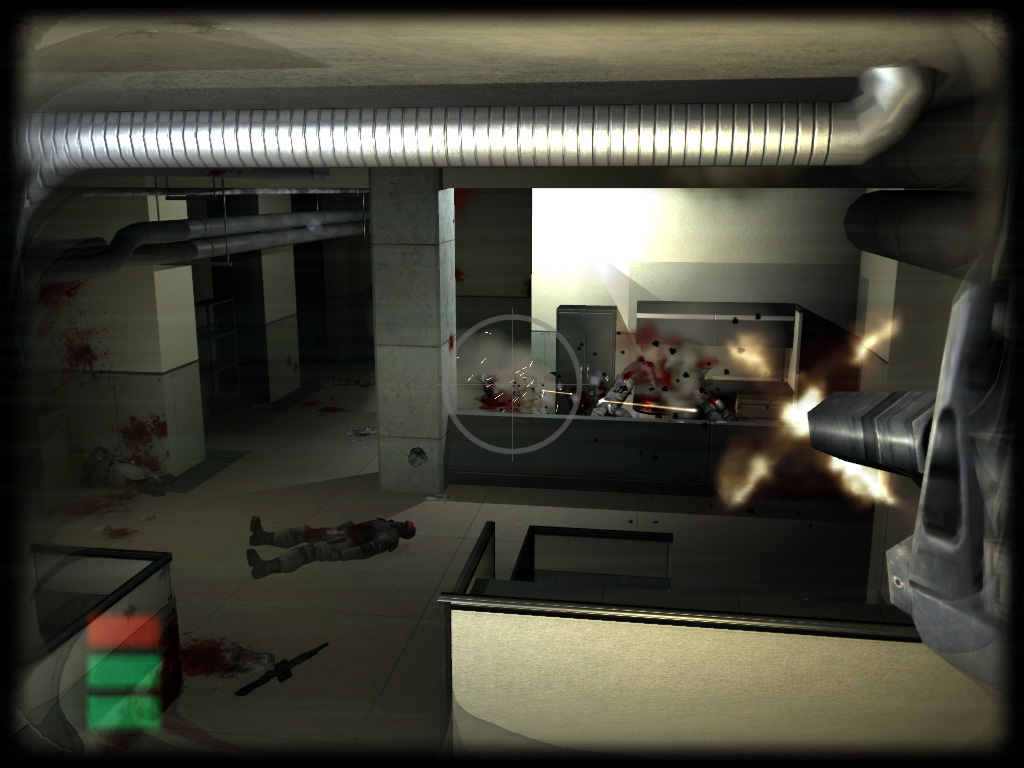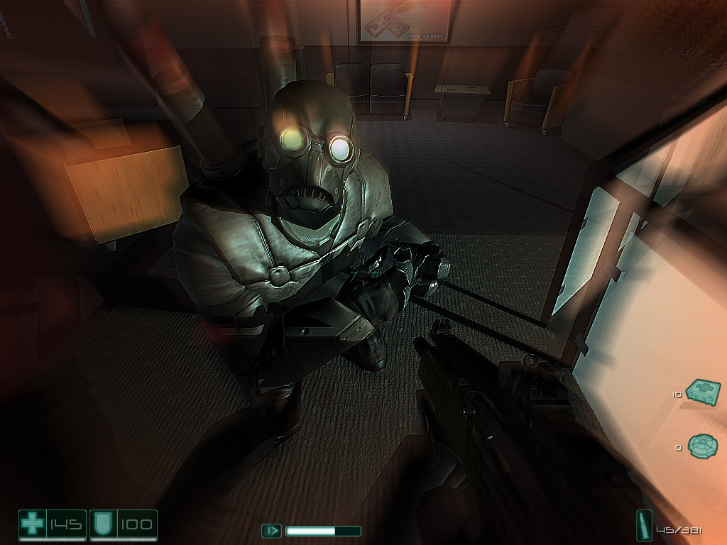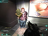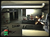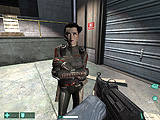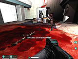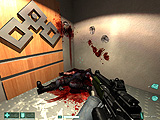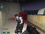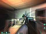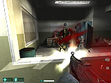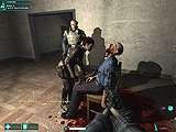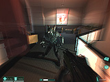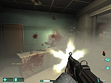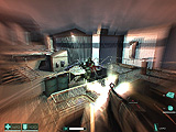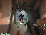 しかも,敵のAIはかなり優秀だ。NOLF2のAIも出来が良くて評判だったが,今回,ステルス要素が取り除かれた分だけ戦闘に特化したらしく,遮蔽物の陰に隠れる(机を蹴り倒したりして遮蔽物を作り出す),こちらの背後に回ってくる,一人が制圧射撃を加えている間にもう一人が接近してくる,といったようなことを平気でやってくるから始末が悪い。登場はスクリプトによるが,出現してからは独自の行動をするので,同じ場所でも戦闘パターンはそのつど変化する。物音を聞き取るなど認識力も高く,手ごわい。ただし,敵の種類はそれほど多くなく,その点はちょっと残念。