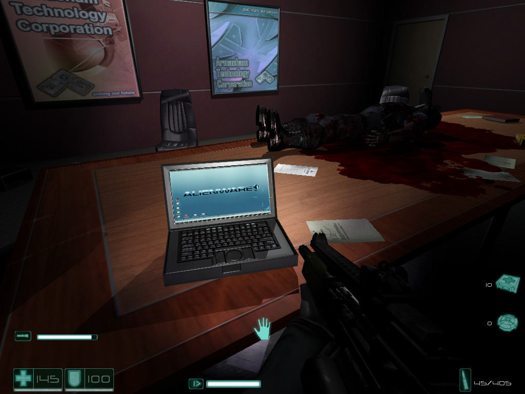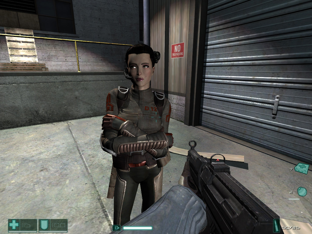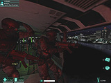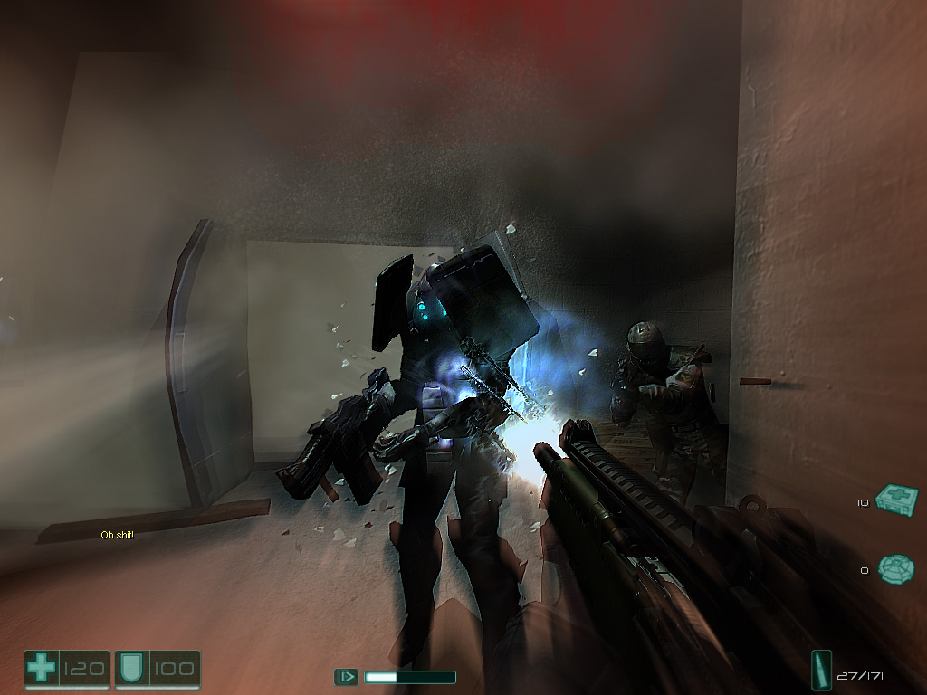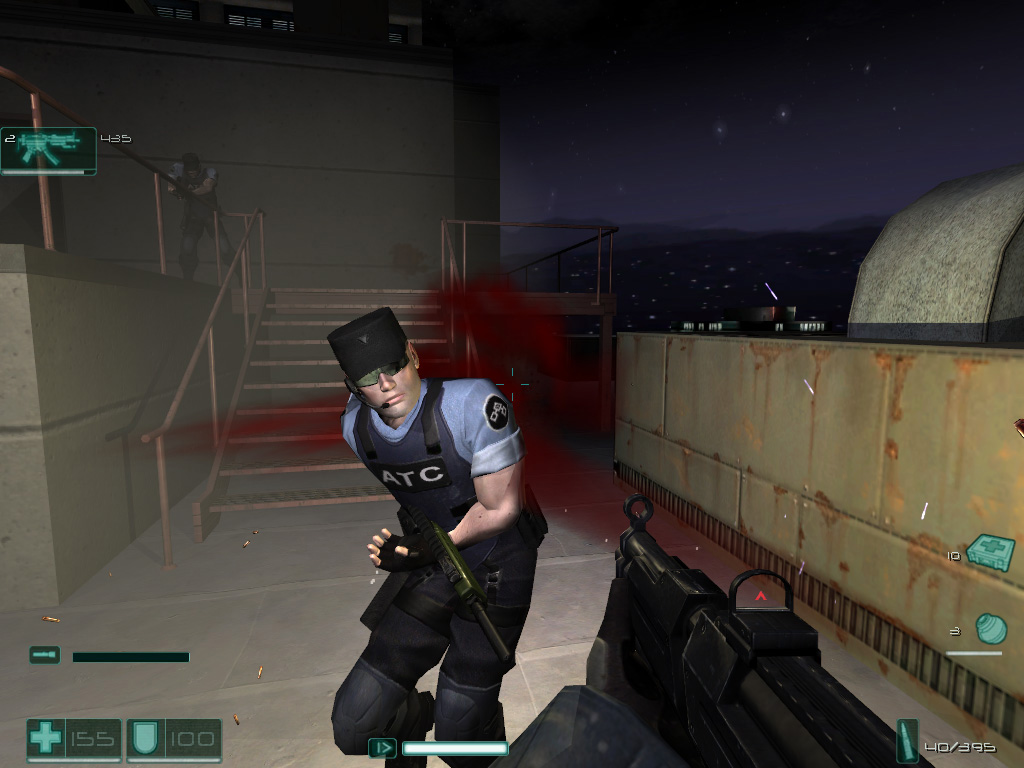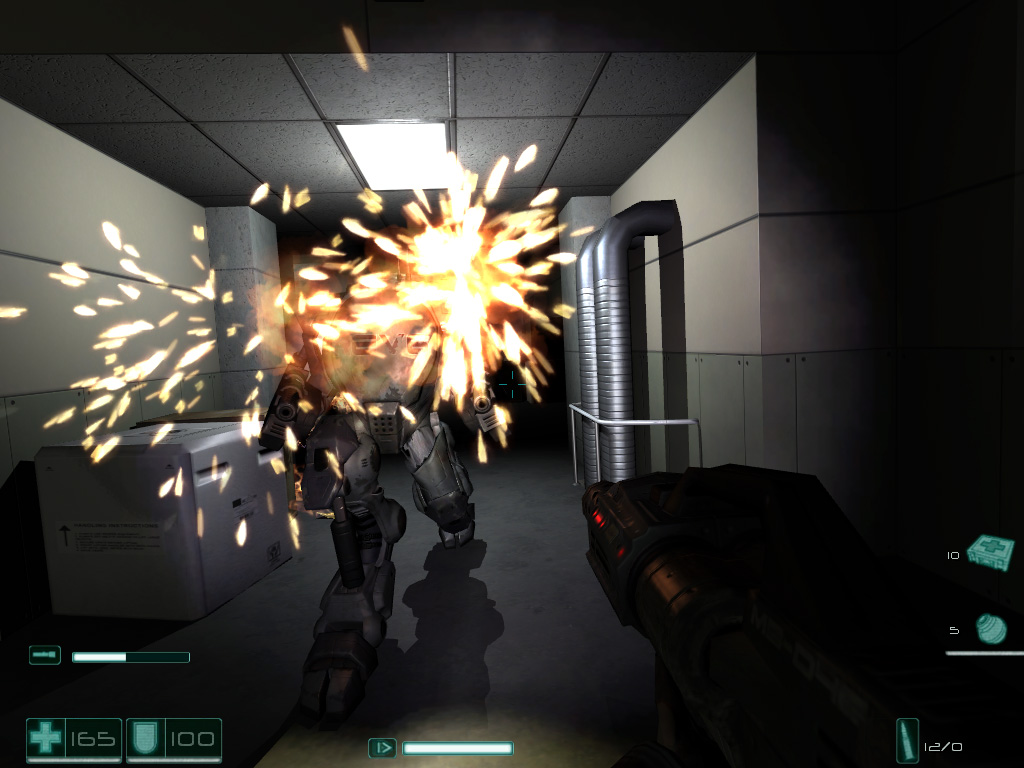 しかも,敵のAIはかなり優秀だ。NOLF2のAIも出来が良くて評判だったが,今回,ステルス要素が取り除かれた分だけ戦闘に特化したらしく,遮蔽物の陰に隠れる(机を蹴り倒したりして遮蔽物を作り出す),こちらの背後に回ってくる,一人が制圧射撃を加えている間にもう一人が接近してくる,といったようなことを平気でやってくるから始末が悪い。登場はスクリプトによるが,出現してからは独自の行動をするので,同じ場所でも戦闘パターンはそのつど変化する。物音を聞き取るなど認識力も高く,手ごわい。ただし,敵の種類はそれほど多くなく,その点はちょっと残念。