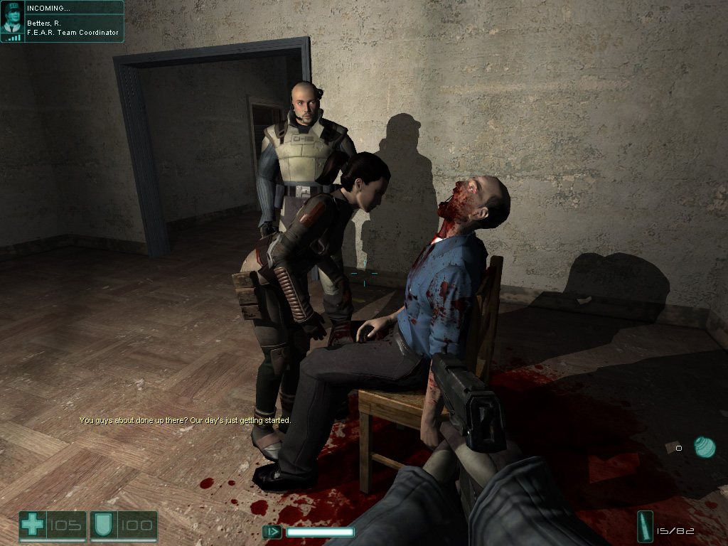 超常現象に対応するF.E.A.R.の隊員達はそれぞれが特技を持っており,主人公の場合はどうやら「過去に起きたことをビジョンとして見られる」ことらしい。まことに迷惑な能力である。おっかないったらありゃしない。ちなみに,後述する「Slo-Mo」(スローモ)ともども,主人公がなぜこのような特殊能力を持っているか,についてもストーリーと微妙に絡んでいる。言えないけど。もう一つちなみに,主人公には名前がなく,またゲーム中は一言もしゃべらず,その姿が鏡に映ったりすることもないので,どんな顔かたちなのかはよく分からない。F.E.A.R.には先週配属されたばかりだ。