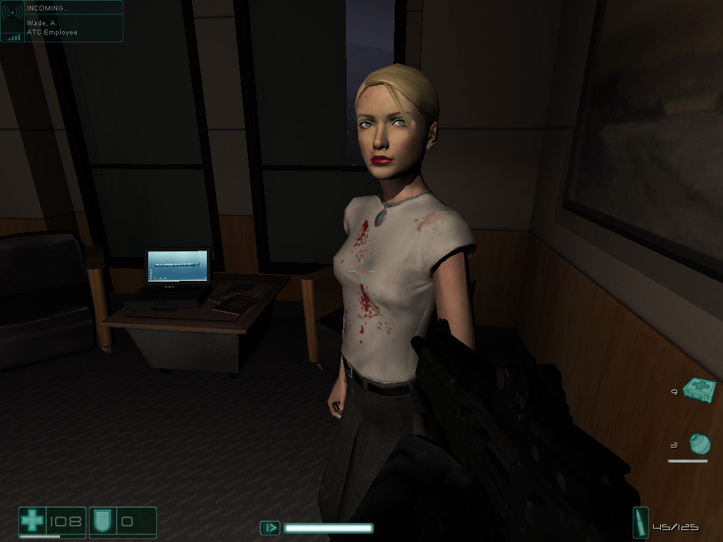 | アーマカムのビルに向かうヘリ。グラフィックスは明らかにトップレベルだが,暗いシーンばかりなのでちと疲れる | ノートPC,留守番電話の記録,本部からの無線連絡などを聞いて,だんだんと話の内容が分かってくる仕掛け | 本社ビルで生存者発見。ただしこの人,何やら挙動不審。実は,こいつのためにひどい目に遭うことになるのだ |