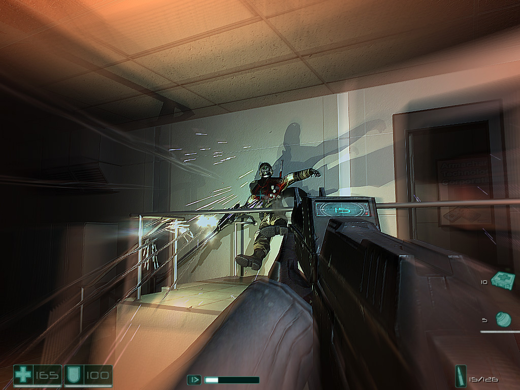 物語の舞台となるのは,巨大軍事企業アーマカム・テクノロジー(ATC)。軍との契約で何やら不気味な実験が行われている施設だが,ある日,そこで生み出されたサイキック・コマンダーの一人,パクストン・フェッテルが突如として狂気に陥り,彼の配下のスーパーソルジャー達がATCの警備員を整然と虐殺し始める……。というオープニングは,シングル版デモをプレイした人ならとっくにご存じだろう。かくしてプレイヤーは,その事件の調査にあたる特殊部隊,F.E.A.R.(First Encounter Assault Recon)のポイントマンとなって,アーマカム社に乗り込みフェッテルを追う,というのが基本的な筋書きだ。