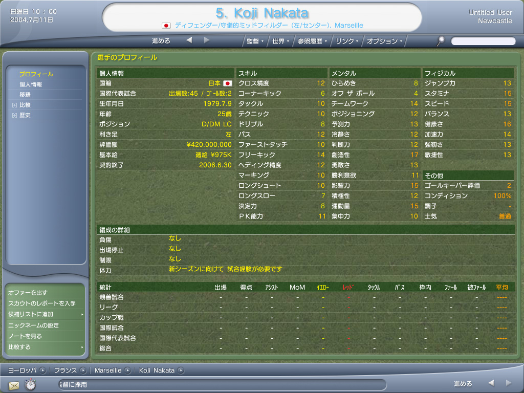 | ゲーム内で最も有名なドイツ人GKといえば,オリバー・カーンではなく,"Jens Mustermann"なのだ | Ver5.0.5パッチをあてると,細かなバグの修正以外に,最近の移籍データが反映される。フランスリーグのマルセイユには,あのトルシエ監督と,1月29日に移籍したばかりの中田浩二が所属している | |