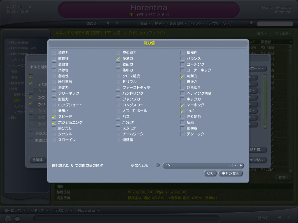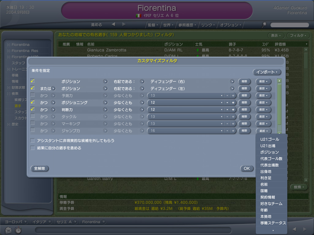 選手の発掘には,主に「選手検索」を使用する。ここにはプレイヤーが活動する地域の有名選手,何万何千人が一覧で表示される。そして,ポジションや年齢のほか,34もあるステータスの最低値/最高値/範囲でフィルタリングして絞り込むといった作業が必要で,マメな作業が嫌いな人はちょっと苦痛かもしれない。