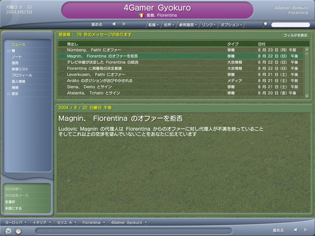 お目当ての選手が見つかったら,獲得のために所属クラブと交渉を行うのだが,これが一筋縄ではいかない。クラブにとって重要な選手だったり,はたまたライバルクラブに所属していたりすると,高額な移籍金を提示しても,すんなりと移籍には応じてくれないのだ。また,クラブが移籍を許可したとしても,選手が同意してくれないと意味がない。選手はお金だけでなく,クラブの格や成績なども考慮するなど,ちょっとした人間くささが,単なるシミュレーションゲームで終わらせない楽しさを生んでいる。