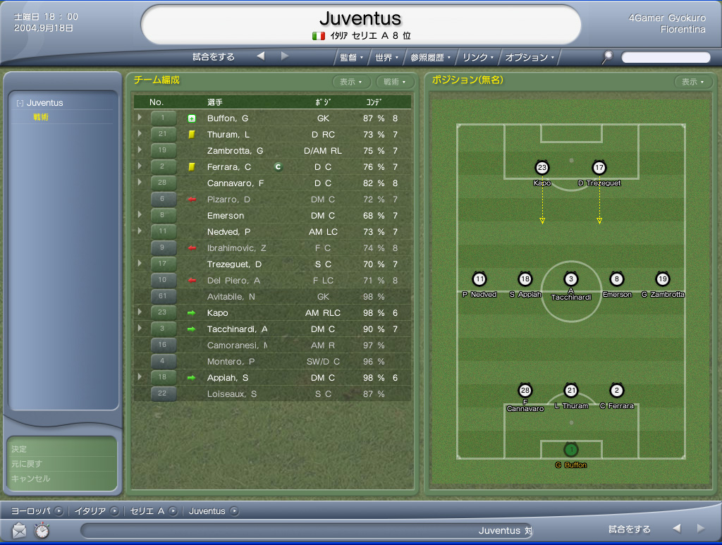 | ユベントスとの一戦。前半,相手は攻撃的な3TOPの布陣を引いて得点する。後半からは,中盤に5人選手を並べたフォーメーションに変更。中盤を支配し,攻撃するスキを与えなかった。この試合でコンピュータは確認できただけで6度も戦術を変更しており,プレイヤーは相手の戦術を細かくチェックして,臨機応変に対処する必要がある | ||
