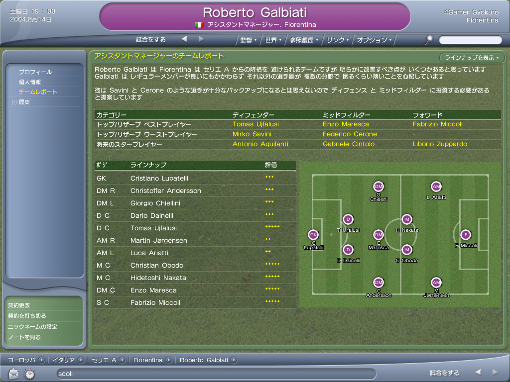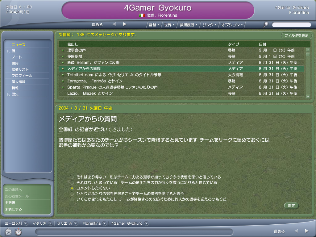 | 戦術や補強のポイントついてアシスタントから助言が得られる。すぐに気付く範囲のものだが,初心者にはありがたい | メディアはことあるごとに質問をしてくる。選択した回答がそのままではなく,ねじまげられて文章になる(なるように感じる)ことがあるのは,現実さながらである。右の画面のように,返答次第では選手のモチベーションが上がるので,うまく活用したいところ | |