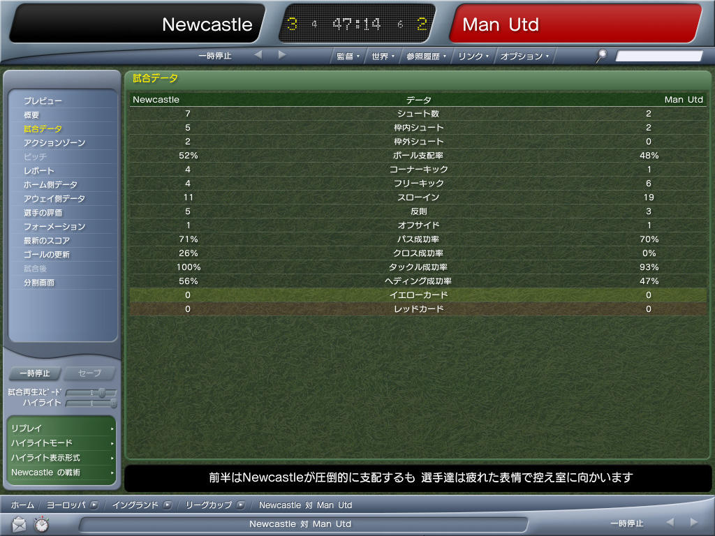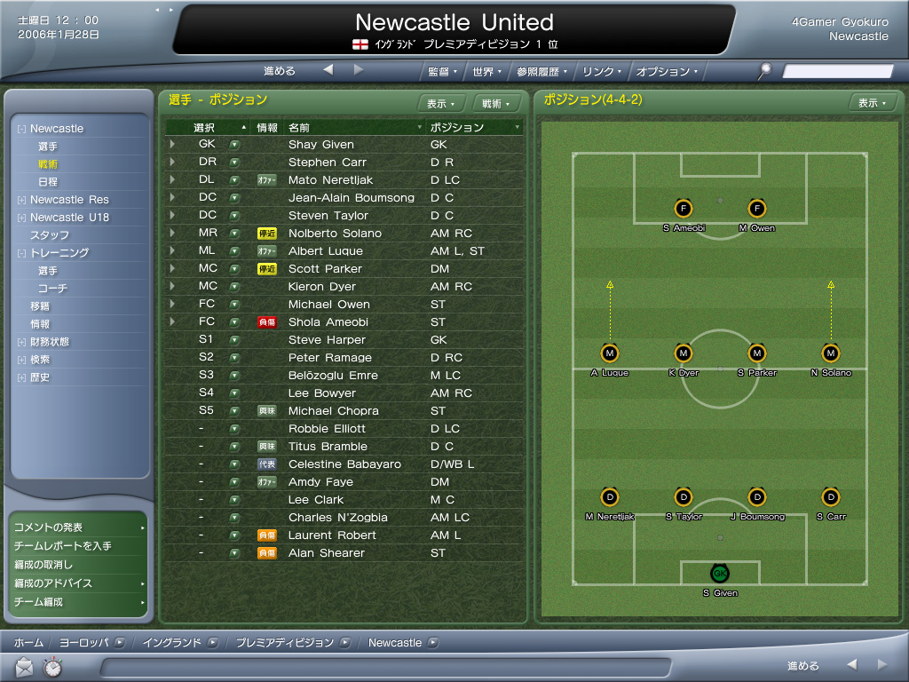 筆者はレビューを執筆するにあたり,イングランド,プレミアリーグの「ニューカッスル ユナイテッド」で初めてプレイした。英国を代表する2人のストライカーが所属していて攻撃面は優秀だが,ゴールキーパー以外のディフェンスに不安があるのと,選手層の薄さに問題があり,リーグ中位がシーズンの目標となるようなクラブだ。筆者の場合,このシリーズの初プレイはだいたいさんざんな結果に終わることが多いのだが,今回は,チームトーク機能のおかげで士気をあまり低下させずに済んだためか,1月の時点で13勝2敗5分39得点13失点で首位に立った。戦術がたまたまハマッた可能性も否定できないが,士気の安定は,ゲームの難度をやや低くしたように感じられる。