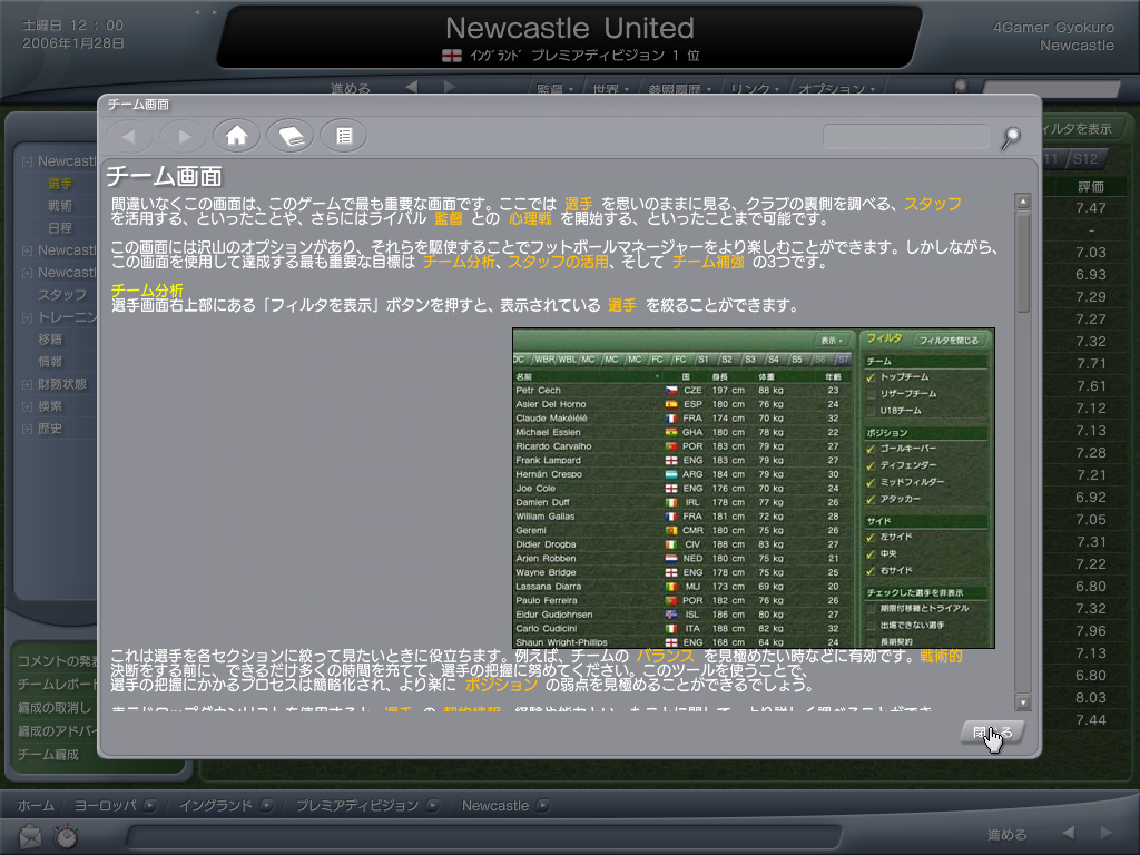 ここまでが試合までの準備となるが,ゲーム画面に負けず劣らず,プレイ内容も地味である。しかも,トレーニングの結果はゲームが進行しないと分からないし,作成した戦術の良し悪しも試合をするまで分からない。選手の獲得だって手間がかかるわけで,初心者はきっと戸惑うことだろう。そのようなプレイヤーのために,本作からはチュートリアル(Windowsのヘルプのようなもの)がゲーム内に用意された。しかしこれも今一つ分かりにくいため,結局は慣れて覚えるしかないだろう。