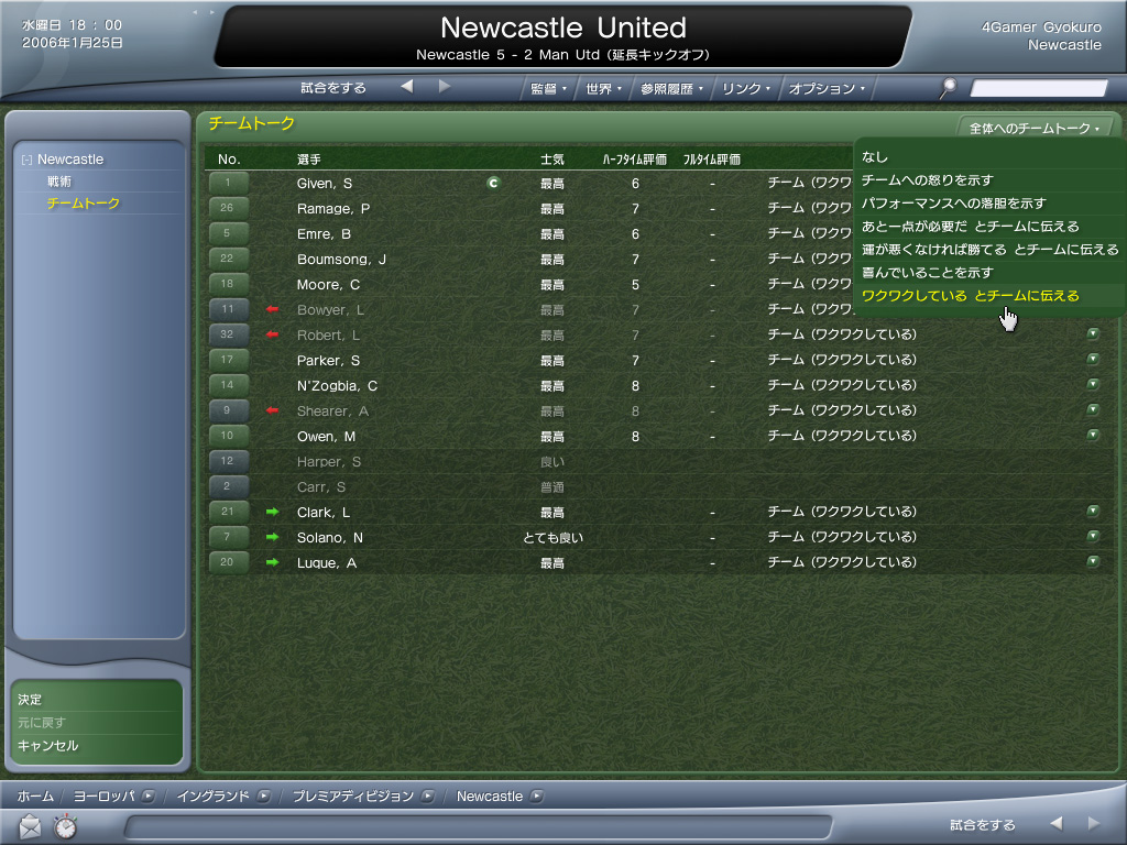 | チームトークではプレイヤーが,試合中の評価を各選手にコメントで伝える。適切のコメントを選ぶと士気は上がり,高いパフォーマンスを発揮する。ただし,明らかに間違ったコメントを選択すると士気は下がり選手は不満をあらわにする。なお,コメントをしない“なし”を選ぶと選手は不安がるので,チームトークが面倒ならば,アシスタントマネージャーに任せる設定にしておこう | ||
