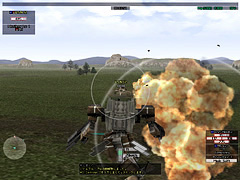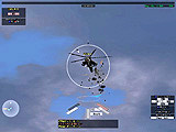 | CPU敵の一つ,戦闘ヘリ。誘導ミサイルを装備しているタイプは攻撃力が高く,少々やっかいである | レーダー画面。ステルス機以外は,敵味方ともに位置を確認できるので,活用する機会が多い | 戦場は時間とともに変化し,画面のような夕方や夜間などもある。また,天候も変化し,雨が降ることも |