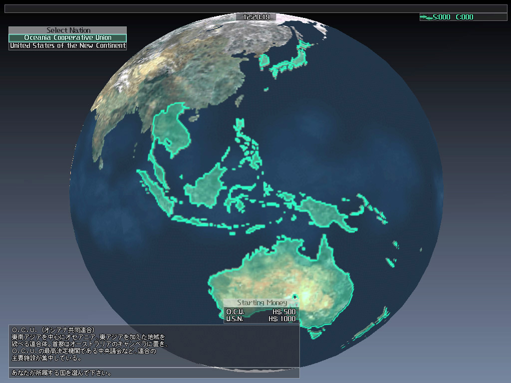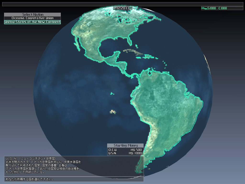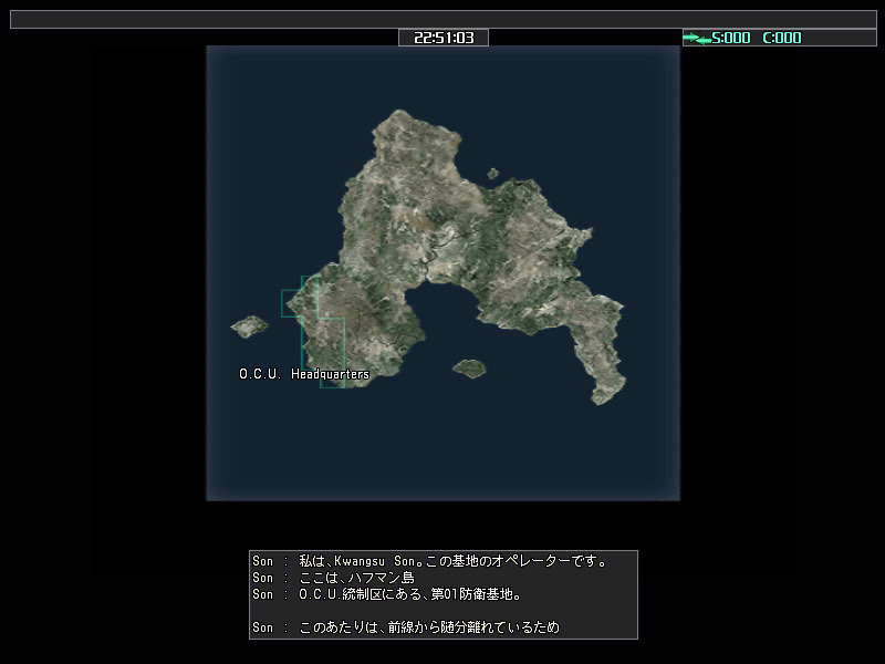 ゲームをスタートしたら,まずはどちらの陣営に所属するかを選ぶ。両陣営の差異は,まず最初に支給される金額が異なり,U.S.N.の方が500H$(ハフマンダラー)多い。また位置的には,O.C.U.がハフマン島西部,U.S.N.が東部を支配しており,中央で領土の激しい奪い合いが発生しているという状況だ。U.S.N.のほうがお得なようだが,本作では給与が毎日一定額支払われるし(階級によって額が異なる),戦闘に出て敵機を撃破すれば,そのぶんの報酬ももらえる。500H$の差など些細なものなので,あまり深く考えずに好きなほうを選ぶといいだろう。
