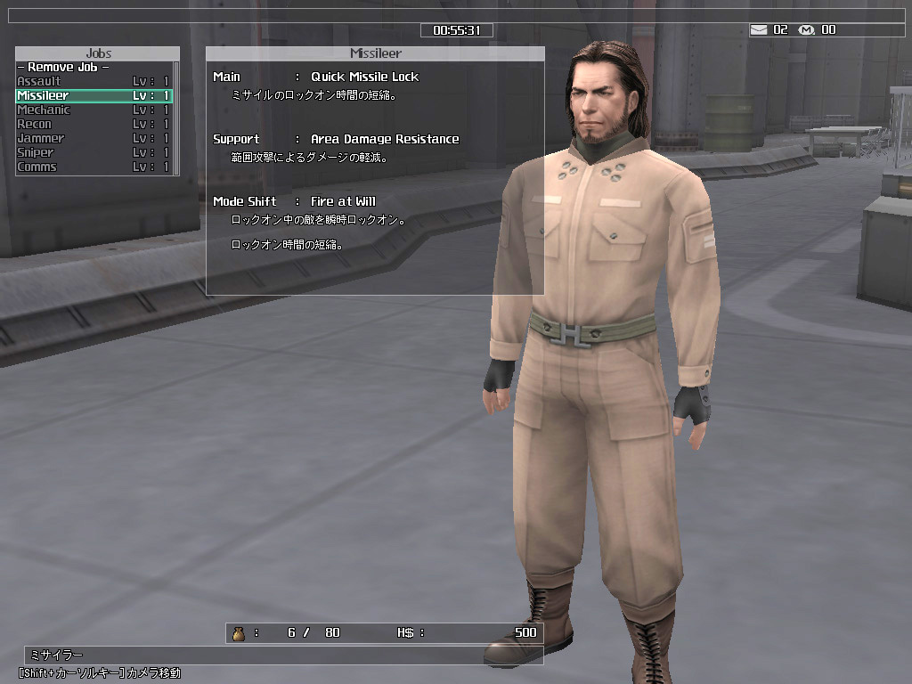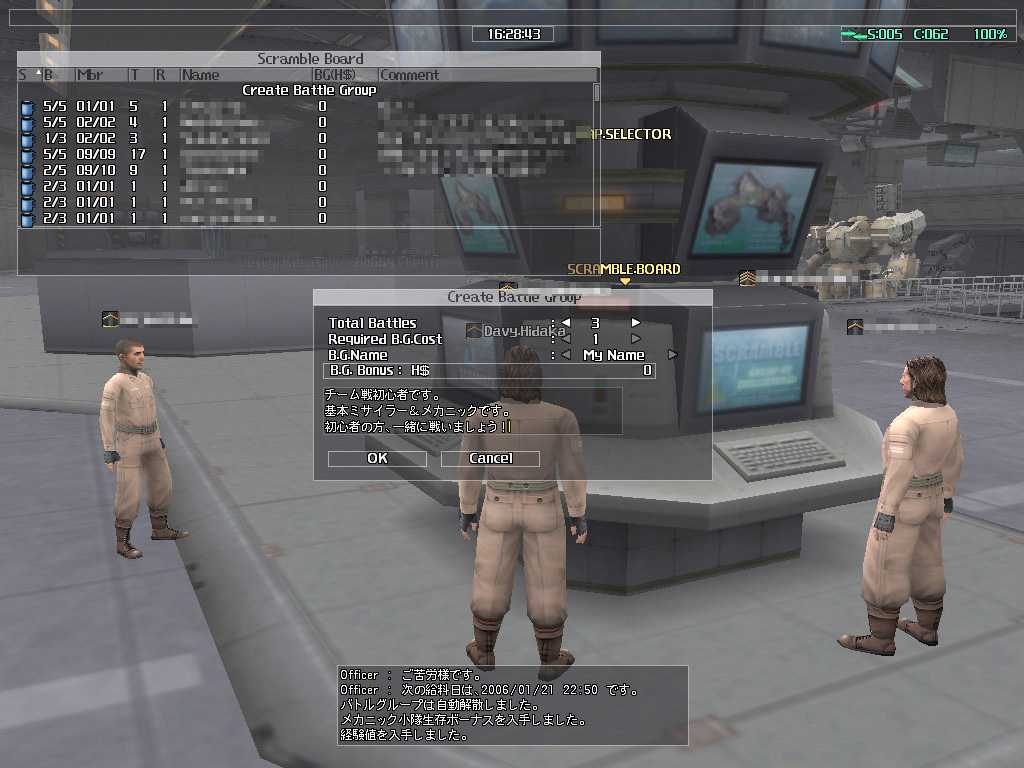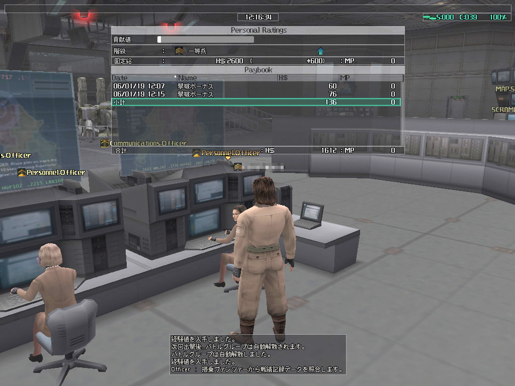 | スクランブルボードで仲間を募っているところ。レベルが低いうちは,アサルトとミサイラーだけでも問題ない | パイロットのジョブのセットアップ画面。7種類のジョブを確認できる。これがまた意外と重要だ | 毎日固定給が支払われるので,人事課に必ず通うこと。また,戦闘終了時のボーナスもここで受け取ることになる |