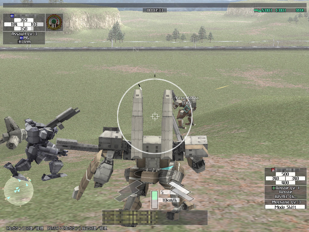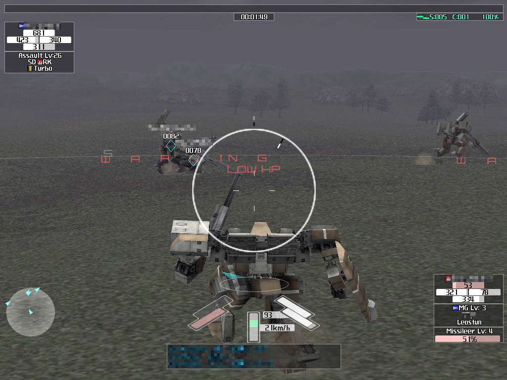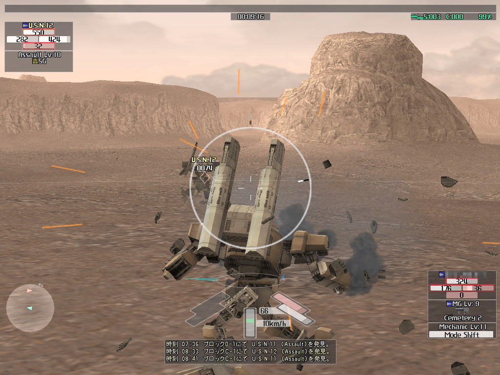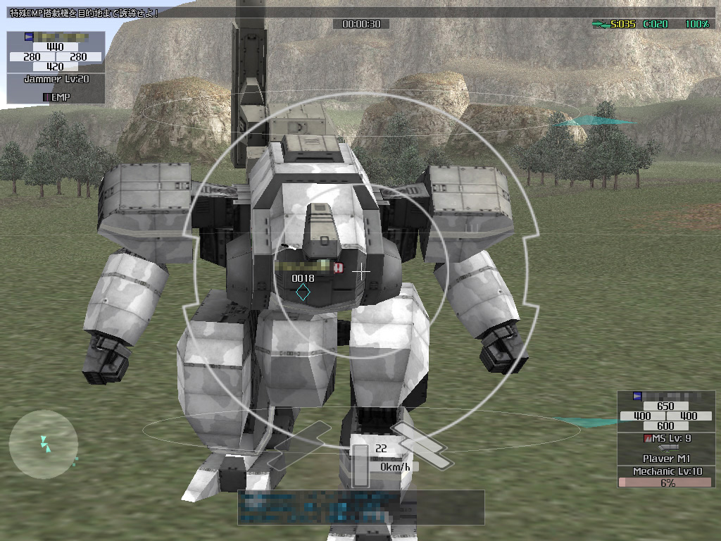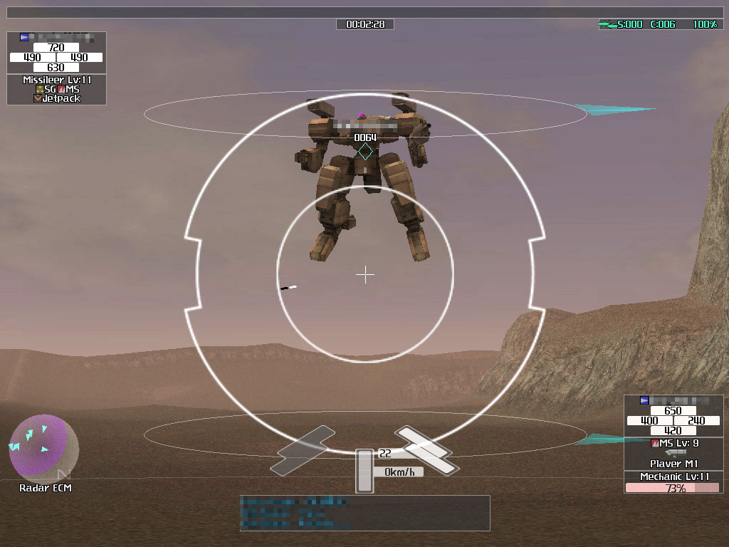 レベル10になったからと思っていたら,まず叶わない相手で,単独での出撃(一人で戦闘に突入した場合はBOTが味方として1機同行し,敵機と2対2の戦闘になる)では,もっと上のレベルの機体がないと無理。BOT機の援護をうまく受ければ勝てないこともないのだが,それも一番簡単なランク1のマップの話。ランク5ともなると,レベルが10台前半では歯が立たない。レベル10程度で手に入るボディの装甲厚では,長射程のロックオン式ミサイルを数発発立て続けに食らうと簡単に破壊されてしまうほどだ。