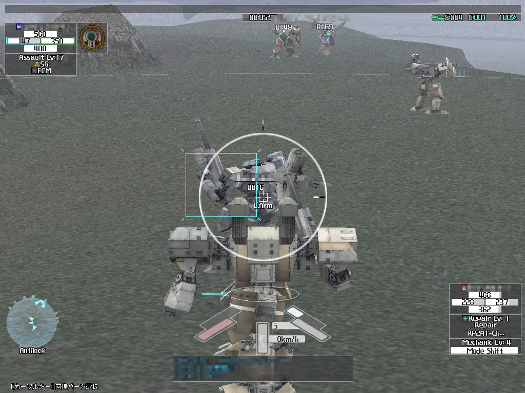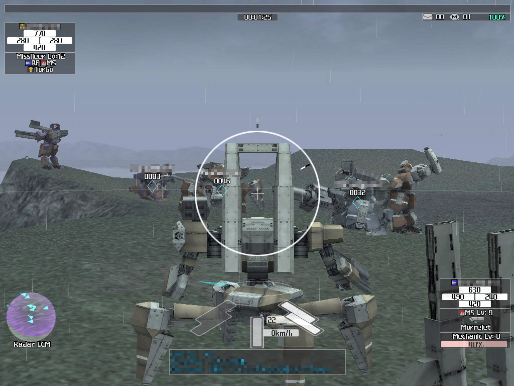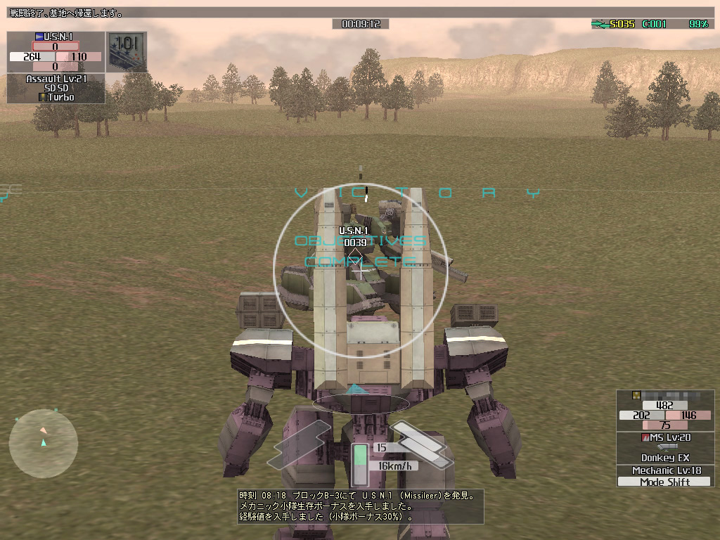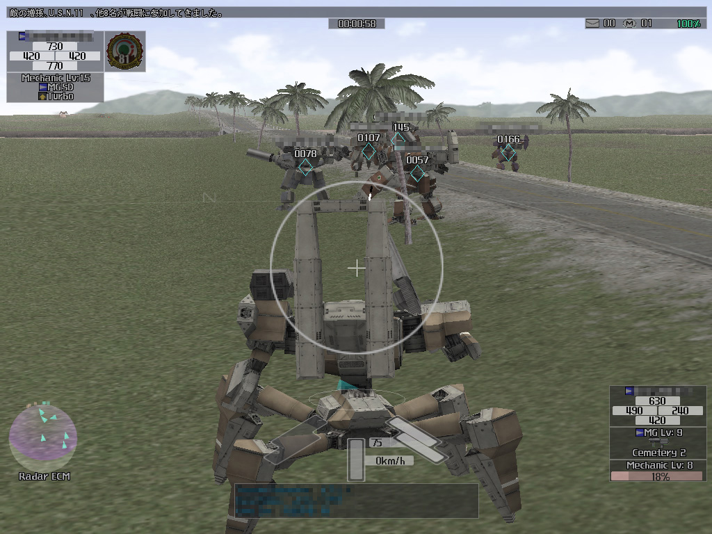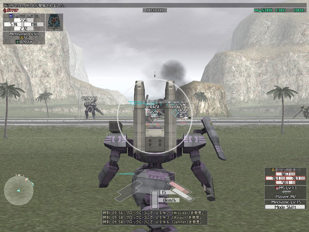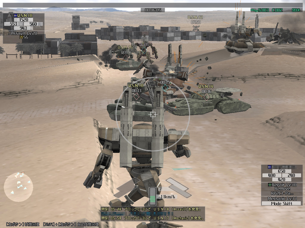 レベル10になったからと思っていたら,まず叶わない相手で,単独での出撃(一人で戦闘に突入した場合はBOTが味方として1機同行し,敵機と2対2の戦闘になる)では,もっと上のレベルの機体がないと無理。BOT機の援護をうまく受ければ勝てないこともないのだが,それも一番簡単なランク1のマップの話。ランク5ともなると,レベルが10台前半では歯が立たない。レベル10程度で手に入るボディの装甲厚では,長射程のロックオン式ミサイルを数発発立て続けに食らうと簡単に破壊されてしまうほどだ。