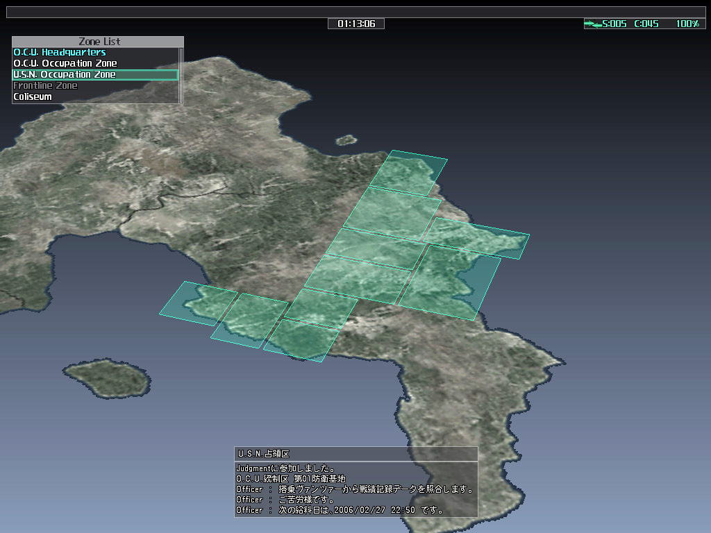 | ハフマン島の中央部が陣取り合戦が展開されている激戦区。レベル20以上になって初めて参加できるPvP戦だ | 激戦区のロビーは2層構造。1階にマップセレクタなどがあり,2階にPersonal Officerらがいる | 激戦区のO.C.U.とU.S.N.の戦局図。戦局図は,本作のトップ画面でも確認できる |