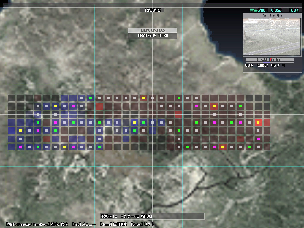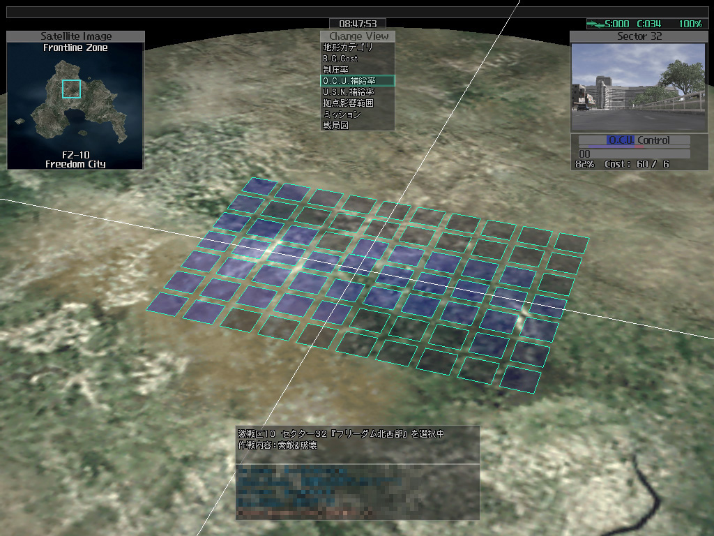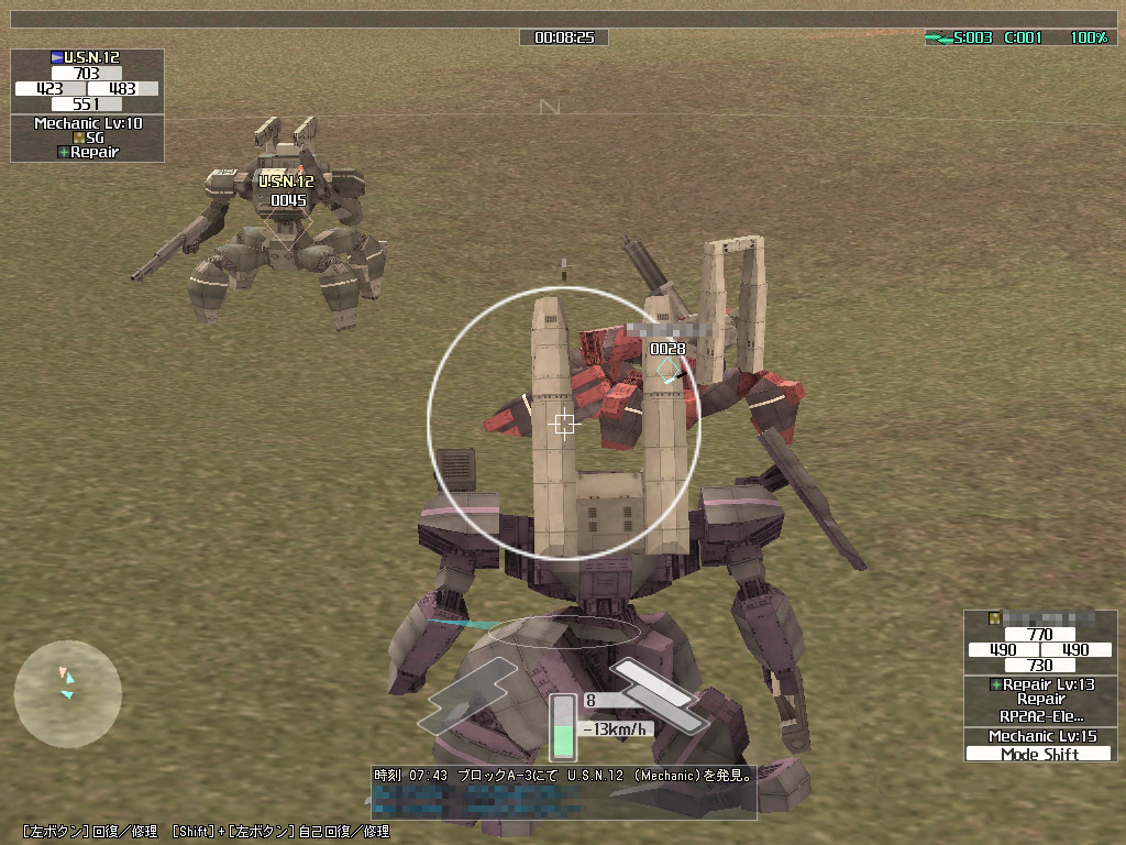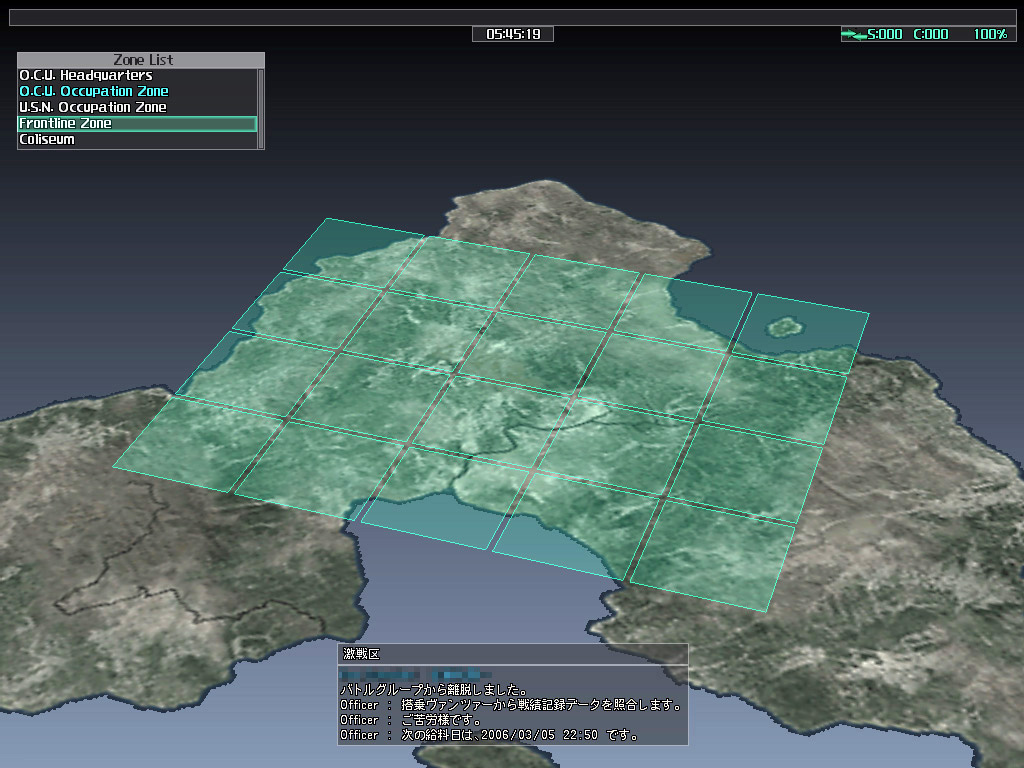 | レベル15になると,敵陣営の占領区へ移動できる。O.C.U.所属の筆者は,U.S.N.の占領区へ移動 | メカニックやミサイラーなどは,アサルト隊が激突する前戦から下がって後方で援護,または待機していよう | 筆者の機体はメカニックなので,あまり機動力がない。しかし敵に接近されてしまい,味方機とともに格闘戦へ |